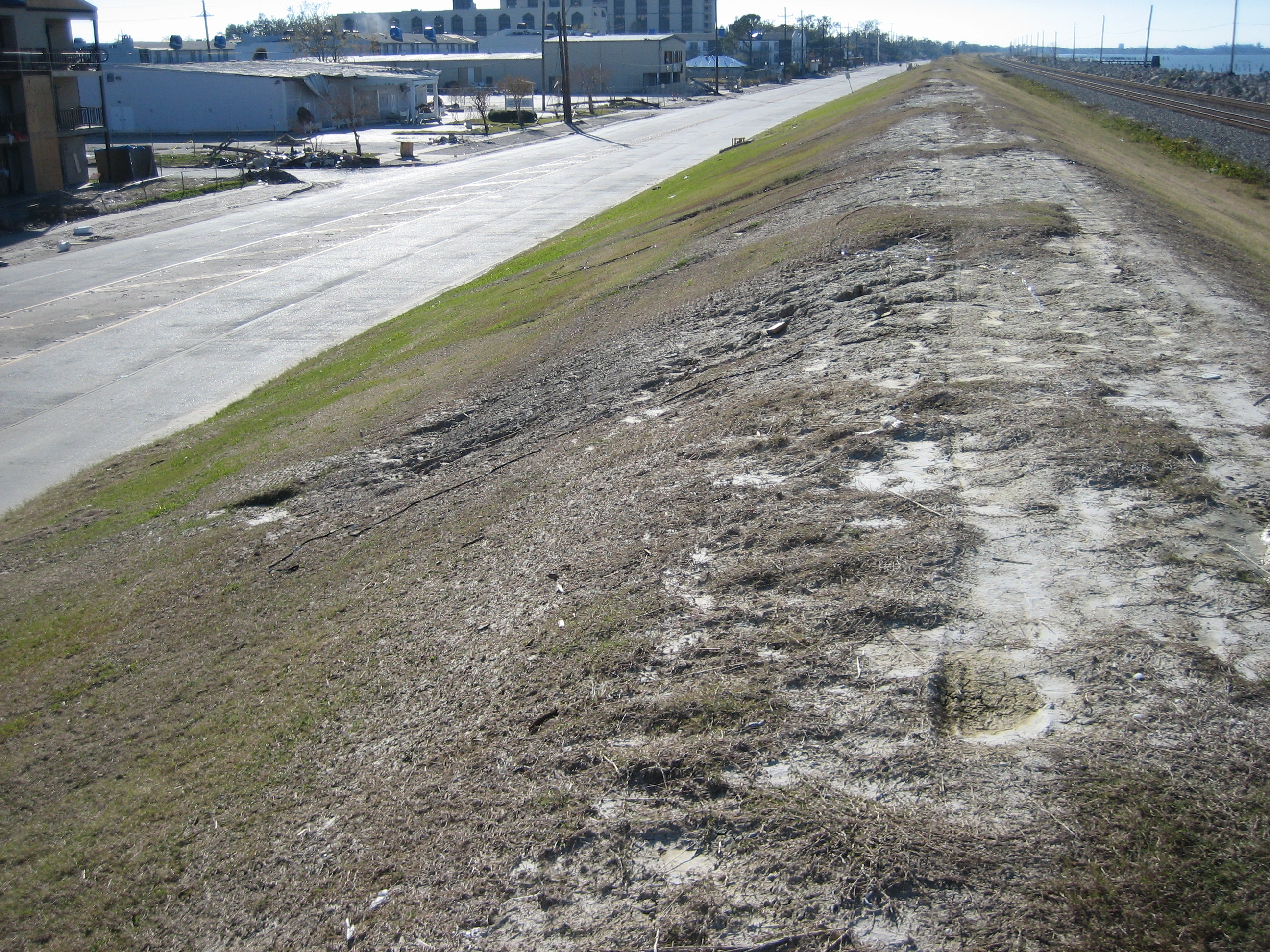 |thumb|200px|넘침에 의한 제방 침식의 흔적. 일부가 제방 발치에까지 미침(뉴올리언스)]]