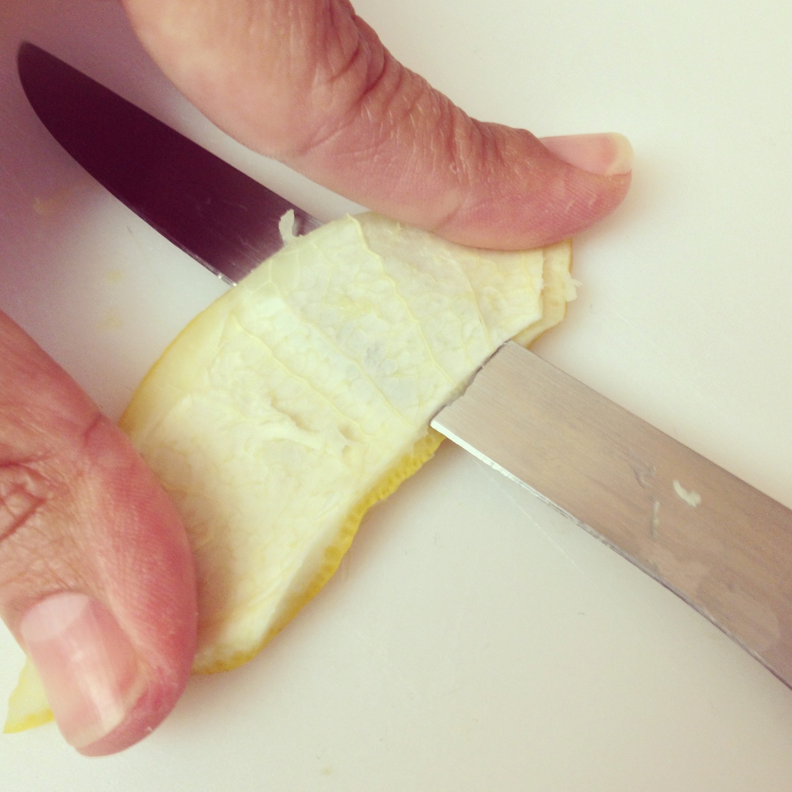 표면의 왁스를 제거한 후, 제스터, 강판, 채소 필러, 파링 나이프 또는 심지어 서폼 도구를 사용하여 과일에서 제스트를 긁거나 잘라낸다. 또는 껍질을 얇게 썰고, 남은 속껍질(있는 경우)을 잘라낸다.