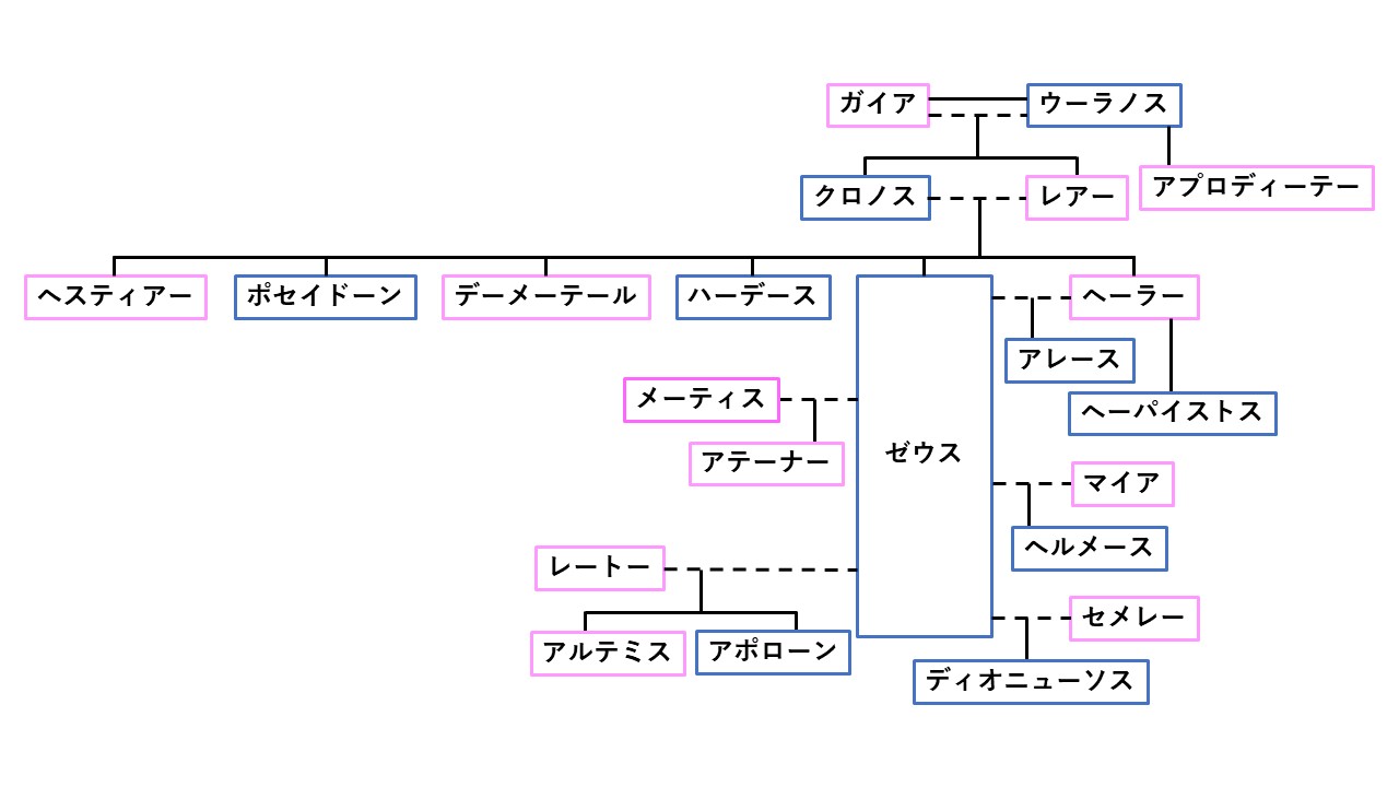 다음은 제우스가 관계를 맺은 여신과 인간 여성, 그리고 그 사이에서 태어난 자식들이다.
