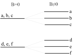 자기장이 없을 때에는 a, b, c는 같은 에너지를 갖고 있다. d, e, f도 마찬가지이다. 자기장이 있는 경우에는 각각 서로 다른 에너지로 분리된다.