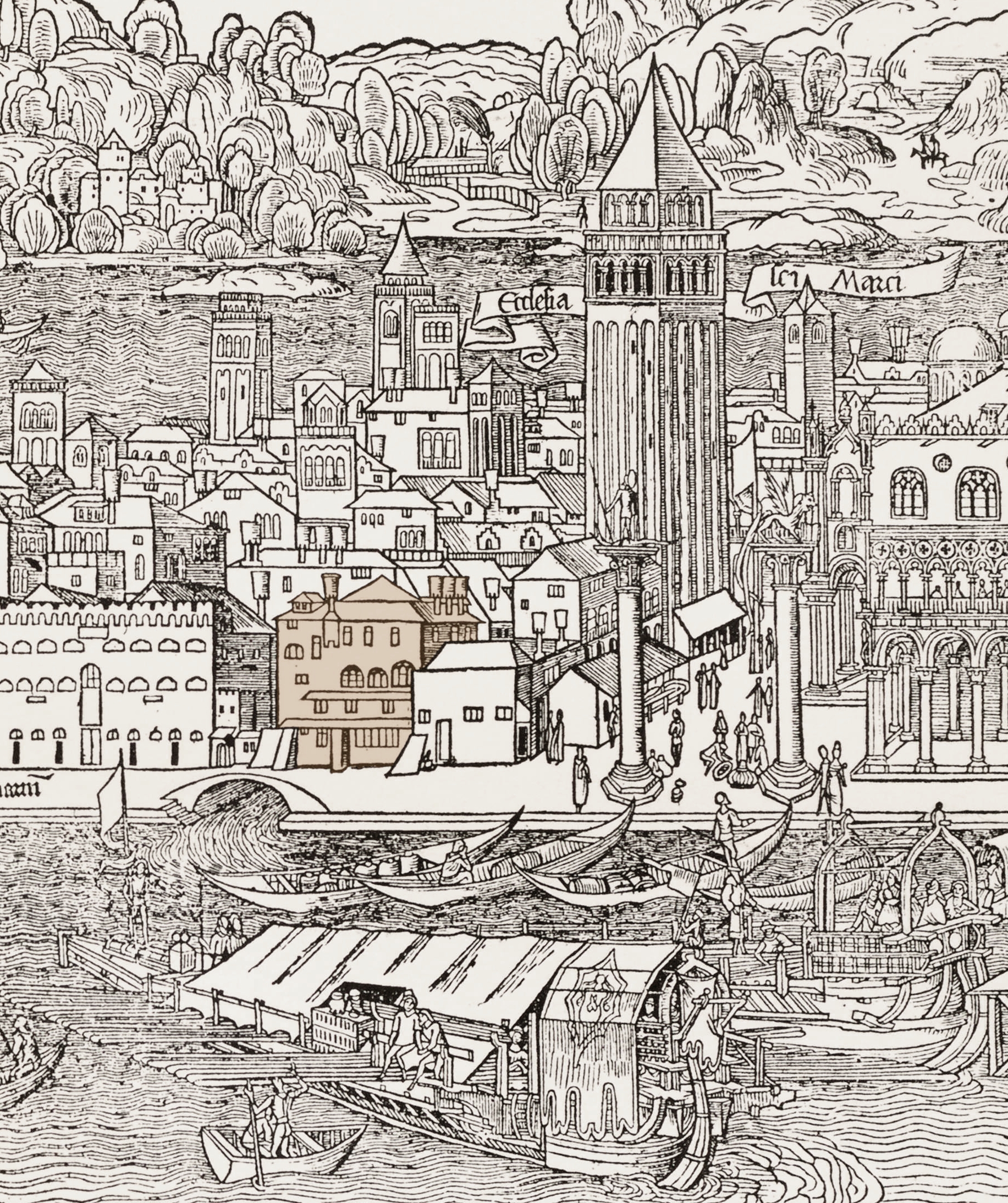 1112년, 대운하 건너편 리알토 시장에서 멀지 않은 산 바르톨로메오 교구에 위치한 초기 조폐창이 문을 닫았고, 해당 토지는 정부에 의해 매각되었다.[2] 판매와 관련된 문서는 해당 부지가 '고대'부터, 아마도 황제 경건왕 루이의 이름을 딴 카롤링거 은화인 지역 화폐의 첫 주조부터 조폐창으로 사용되었음을 나타낸다.[3] 증거에 따르면 12세기 중반에 조폐가 중단된 후 베로나의 주화가 지역 거래에 사용되었고, 비잔틴 동전은 장거리 무역에 사용된 것으로 보인다.[4] 지역 조폐는 비탈레 2세 미치엘 (재위 1156년-1172년) 치세에 처음 공작 주화가 발행되면서 재개되었고,[5] 그로소가 도입되면서 크게 증가했다.[6]