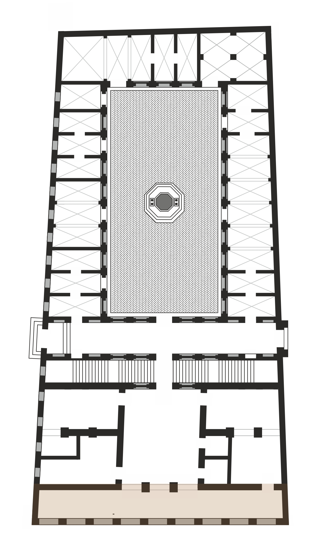 시간이 지남에 따라 주화 수요가 증가함에 따라 이러한 조폐창 시설이 확장되고 층이 추가되었다.[11] 로이비히의 목판화(마인츠, 1486)와 데 바르바리 판화 (베네치아, 1500)는 조폐창을 뒤쪽에 안뜰이 있는 3층 건물로 묘사한다.[12][13] 이 구조는 모든 면에서 경계가 져 있다. 서쪽으로는 운하, 북쪽으로는 10세기에 세워진 순례자를 위한 호스피스, 동쪽으로는 일련의 여관과 육류 시장, 남쪽으로는 산 마르코 관리인 ''de supra''이 소시지와 치즈 판매업자에게 임대한 일련의 덧붙여 지은 가판대가 있다.