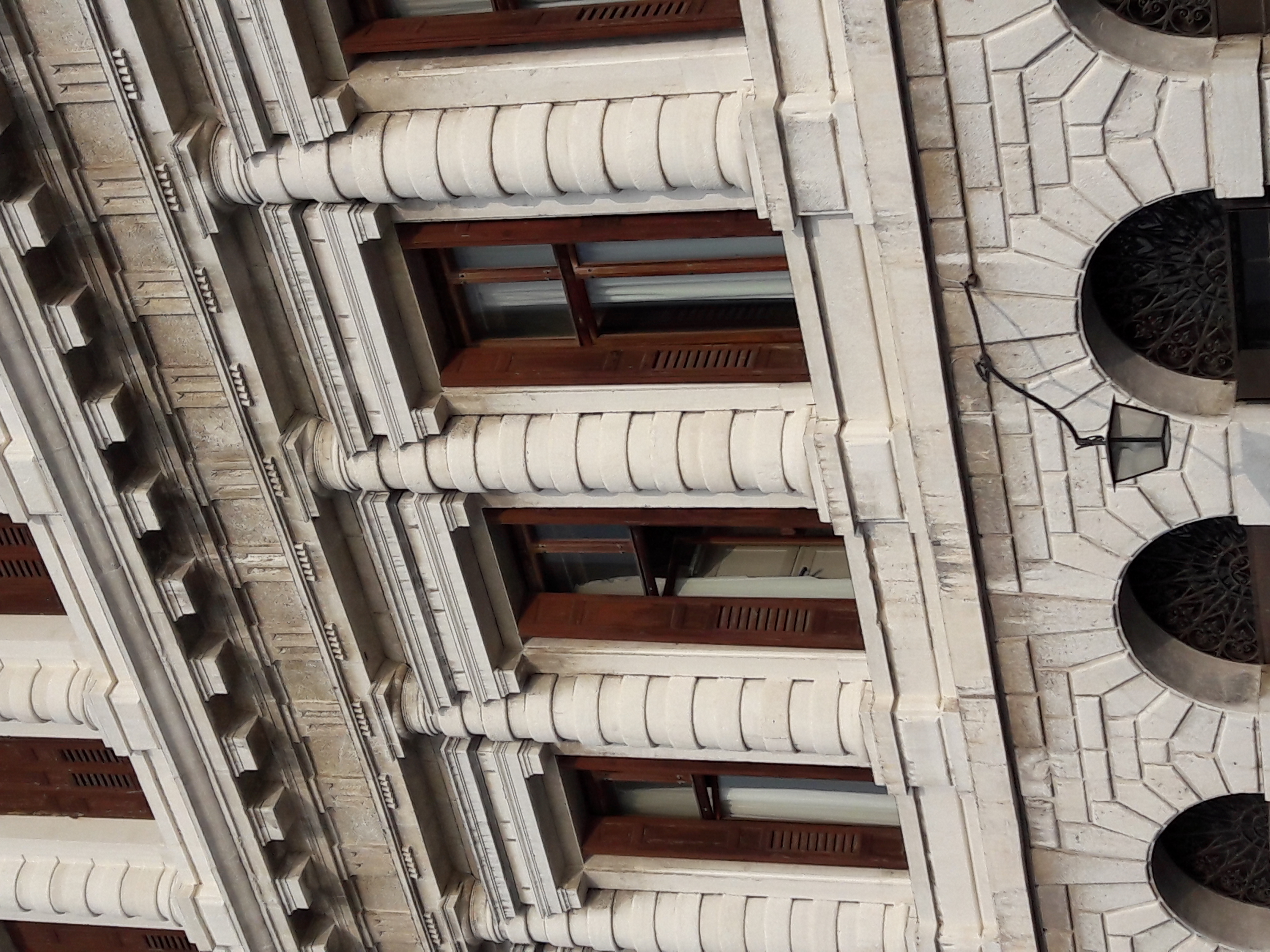 도리스 양식이 적용된 2층의 창문들은 원래 무거운 철제 격자창으로 보호되었으며, 부착 기둥(벽에 붙은 기둥) 사이에 바짝 붙어 있어 노출된 표면 없이 두꺼운 벽 안으로 깊숙이 들어간 듯한 인상을 준다. 이는 건물의 견고함을 더욱 강조하는 효과를 낸다. 창문 위쪽의 육중하고 돌출된 인방(창문이나 문 위의 수평 구조물) 역시 이러한 느낌을 강화한다. 나중에 추가된 최상층에는 이오니아식 기둥이 사용되었고 러스티케이션 기법은 계속되었지만, 창문 주변의 벽이 노출되고 머리 위에는 섬세한 고창(높은 곳에 설치된 작은 창)이 있는 등 주거 건축에서 흔히 볼 수 있는 형태를 띠고 있다. 이는 원래 구조의 디자인과 대조를 이루며 건물 전체의 웅장한 느낌을 다소 약화시킨다.[41]