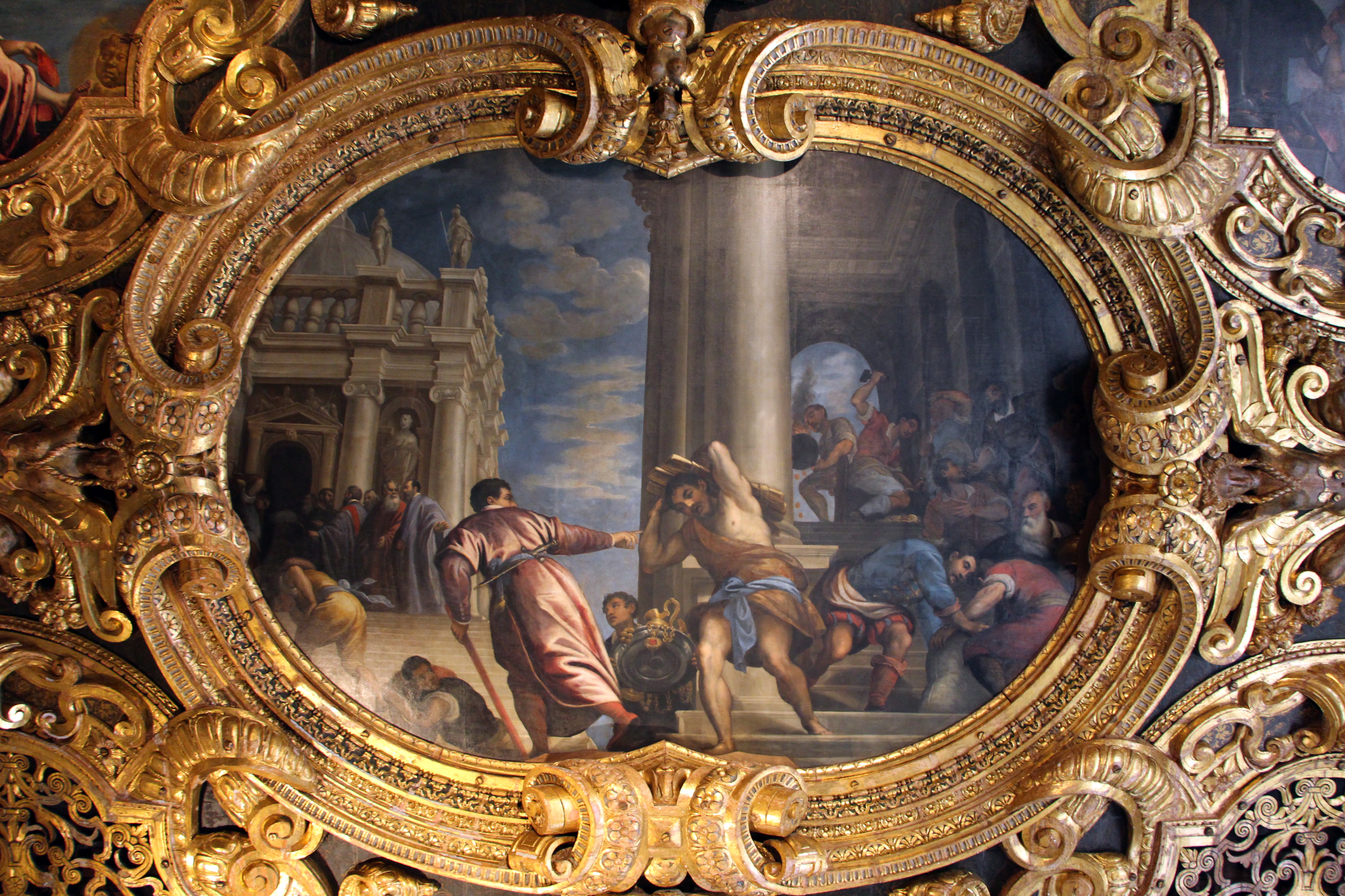 두 개의 아틀라스가 도리스식 엔타블레이처를 지지하며, 표면을 거칠게 마감하는 러스티케이션 기법이 두드러지게 사용된 입구는 이후 마르치아나 도서관의 17번째 아케이드에 통합되었다.[42] 이 통로에는 지로라모 캄파냐와 티치아노 아스페티가 조각한 거대한 조각상 두 개가 배치되었다.