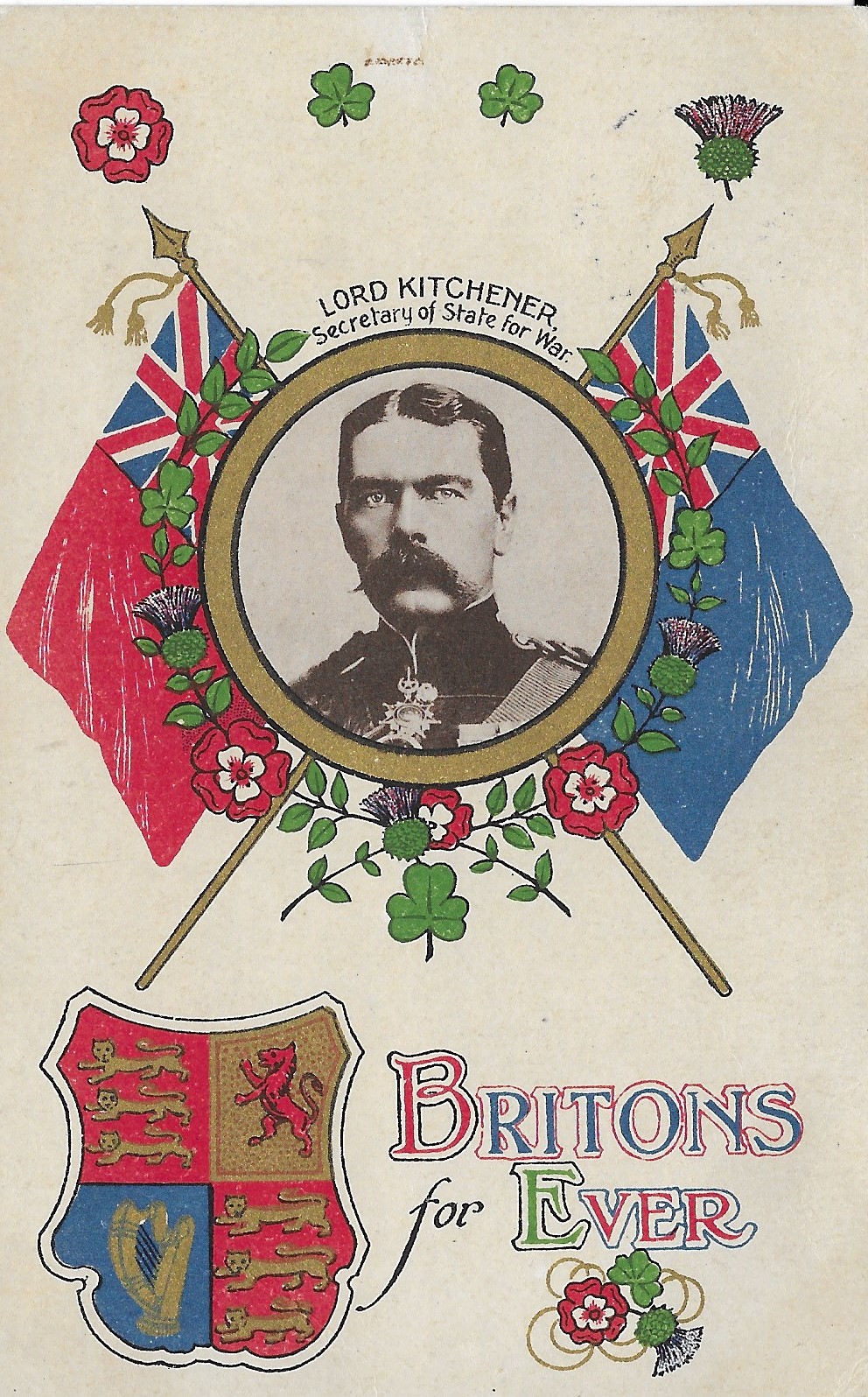 제1차 세계 대전이 발발하자 애스퀴스 총리는 키치너를 즉시 육군 장관으로 임명했다.[42] 영국 내각의 반대에도 불구하고 키치너는 최소 3년 이상 지속될 장기전, 독일을 격파하기 위해 막대한 규모의 새로운 군대가 필요할 것이며, 종전 전에 엄청난 사상자가 발생할 것이라고 정확하게 예측했다. 대규모 제1차 세계 대전 중 영국 육군으로의 징병 캠페인이 시작되었고, 곧 잡지 표지에서 따온 키치너 경, 당신을 원합니다의 키치너의 독특한 포스터가 등장했다. 이 포스터는 많은 자원병을 장려했을 가능성이 있으며, 이후 여러 번 복제되고 패러디되면서 전쟁의 가장 오래 지속되는 이미지 중 하나가 되었다.