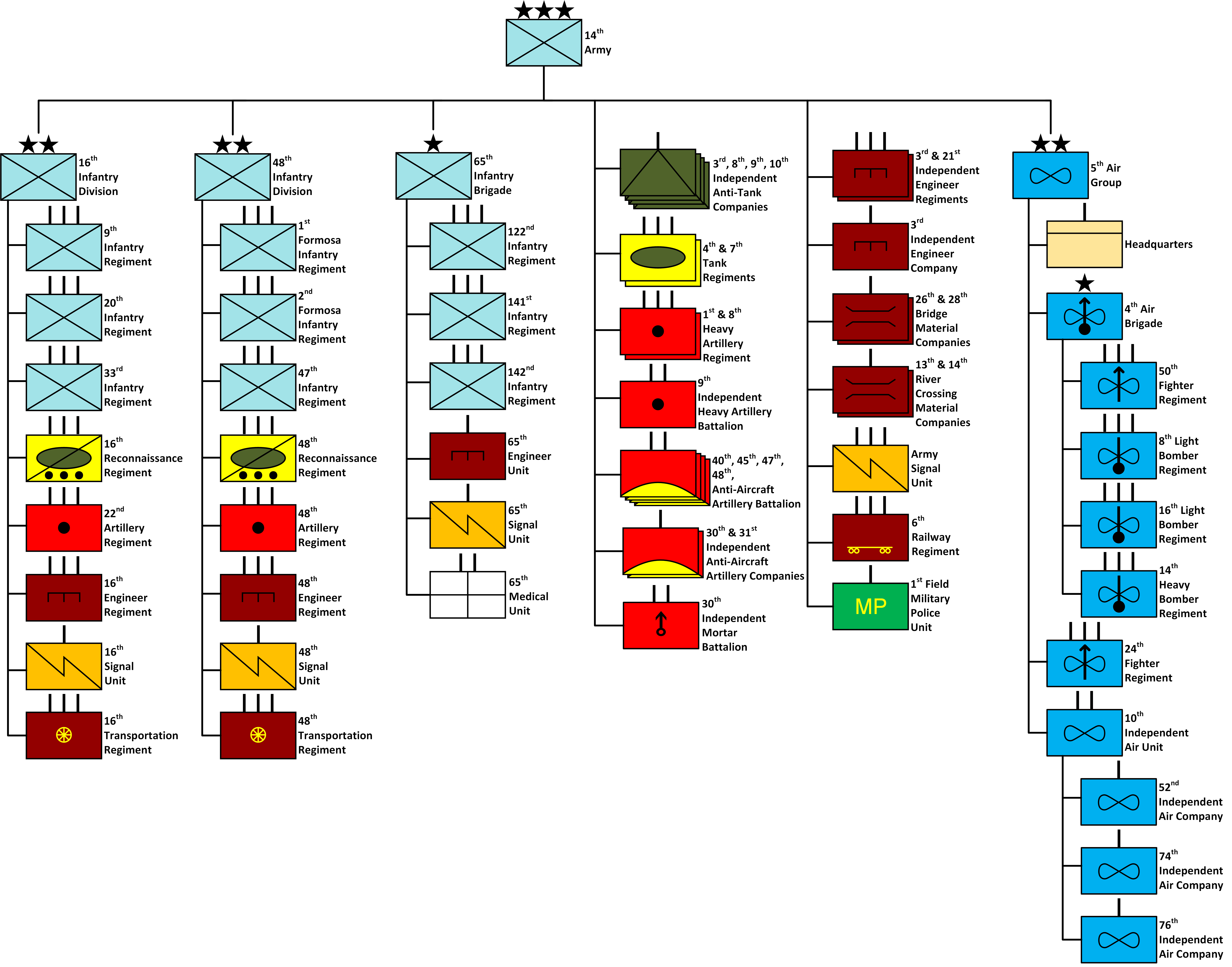 1945년 2월 13일에는 제1정진집단, 제4비행사단이, 3월 6일에는 제41군이 제14방면군 예하 부대로 편입되었다.