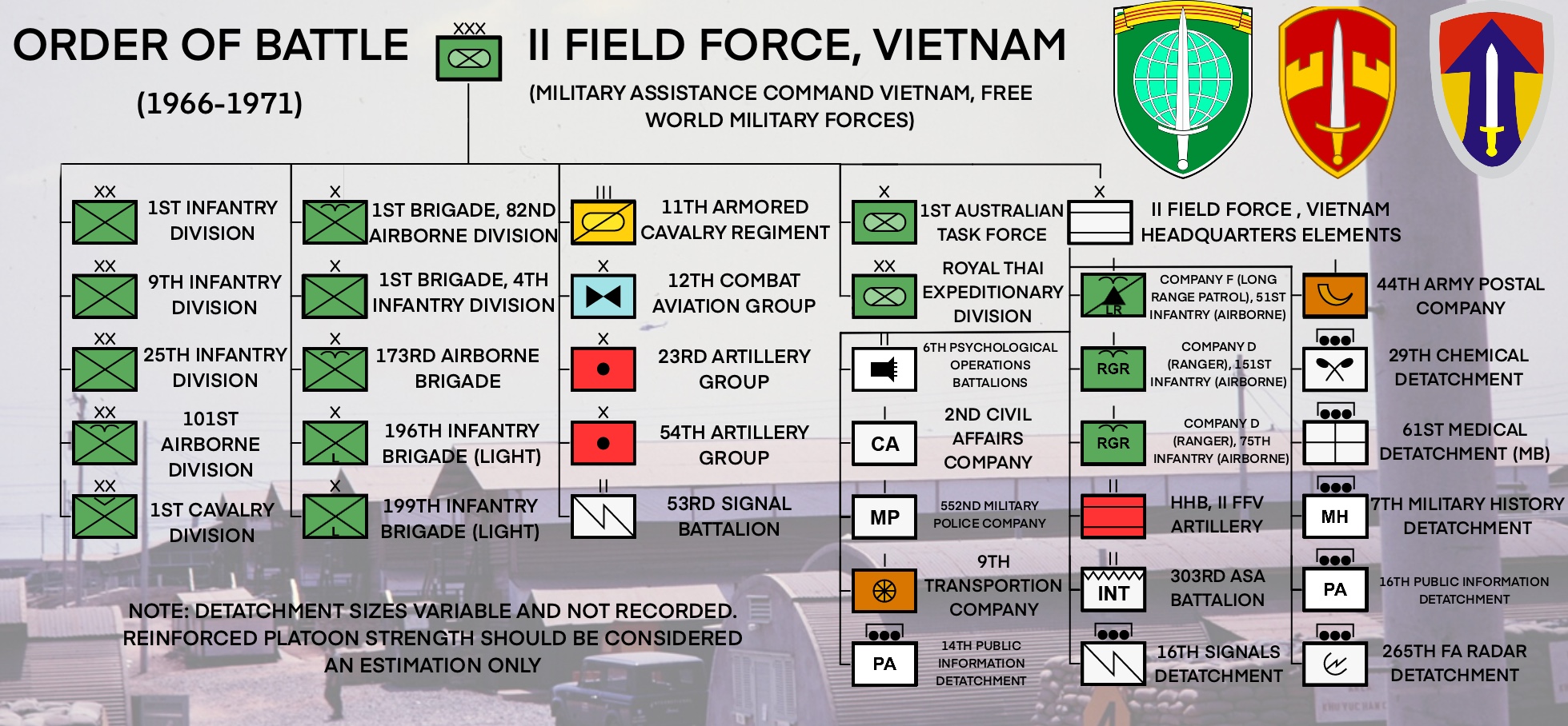 이 외에도, 베트남 전쟁 중 여러 시기에 걸쳐 제1보병사단, 제9보병사단, 제25보병사단, 제101공수사단, 제1기병사단, 제82공수사단 제3여단, 제4보병사단 제3여단, 제173공수여단, 제196경보병여단, 제199경보병여단, 제11기갑기병연대, 제12전투항공군, 제23포병군, 제54포병군, 제53신호대대, 제1호주임무부대, 태국 왕립 육군 의용 부대 등의 다양한 부대들이 제2야전군의 통제를 받았다.