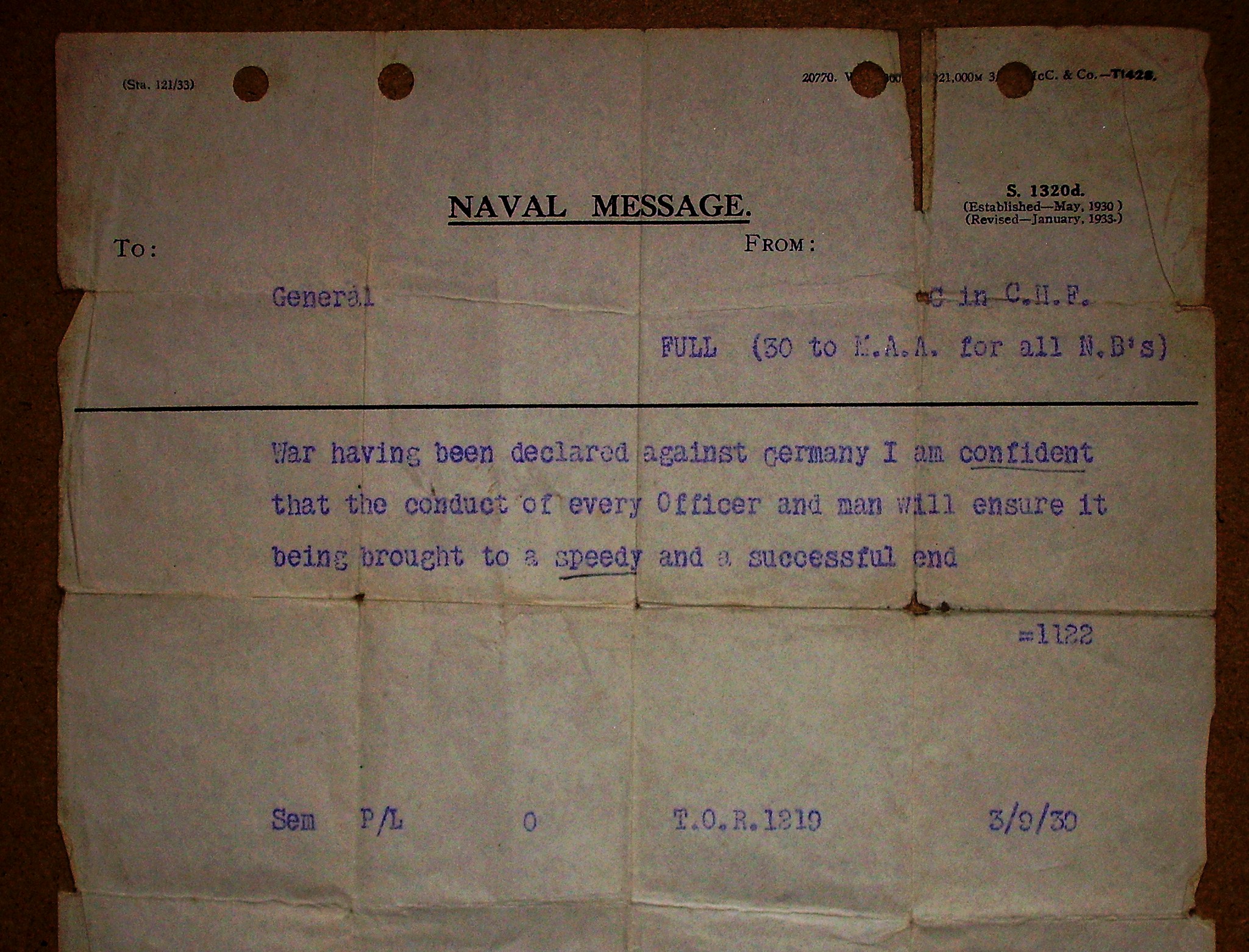 영국 해군 함선에 전쟁 발발을 알리는 메시지.