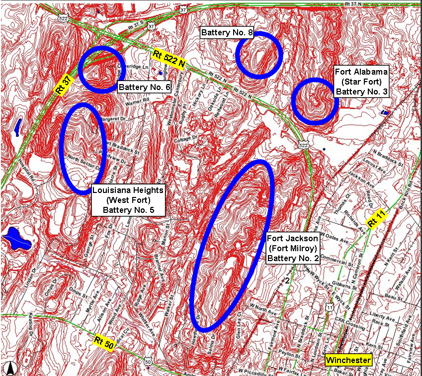 • 오페콘 크릭의 나루터에 있는 퍼킨스밀 포대: 윈체스터에서 남쪽으로 4마일(6km) 떨어진, 프론트 로열 턴파이크의 오페콘 강 나루터에 있는 반월보루 또는 凸角堡