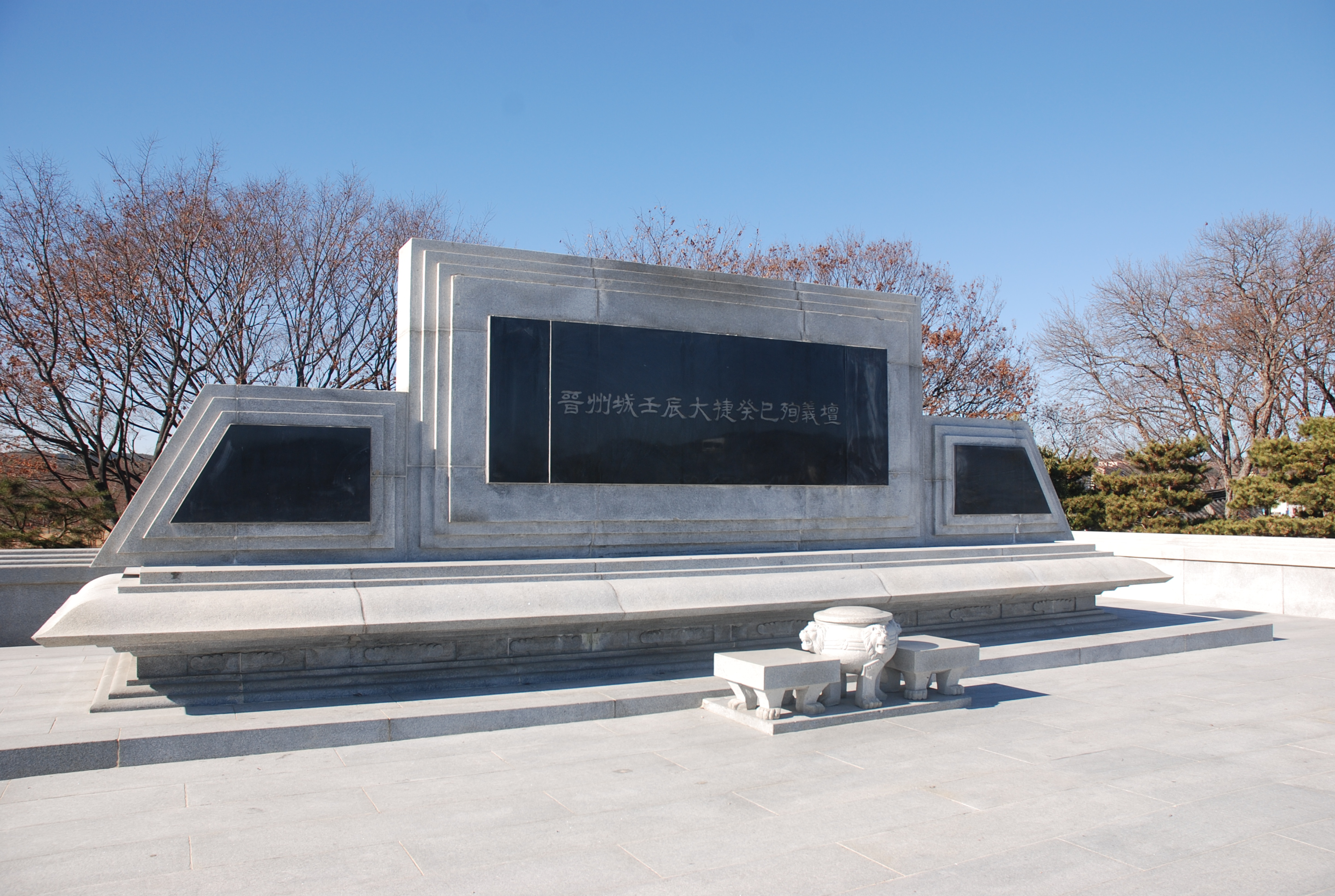 - '''진주성''': 1592년 임진왜란 3대 대첩 중 하나인 진주대첩과 1593년 계사년에 순국한 7만여 명의 군사와 백성을 기리기 위해 여러 기념물이 세워졌다. 1686년(숙종 12년) 건립된 촉석정충단비(矗石旌忠檀碑)는 김천일, 황진, 최경회 등 순국한 이들을 위로하기 위해 세워졌다.[17] 1987년에는 임진대첩계사순의단이 건립되었으며, 경상남도 유형문화재 제2호인 촉석정충단비와 제1호인 김시민 장군 전공비가 있다.