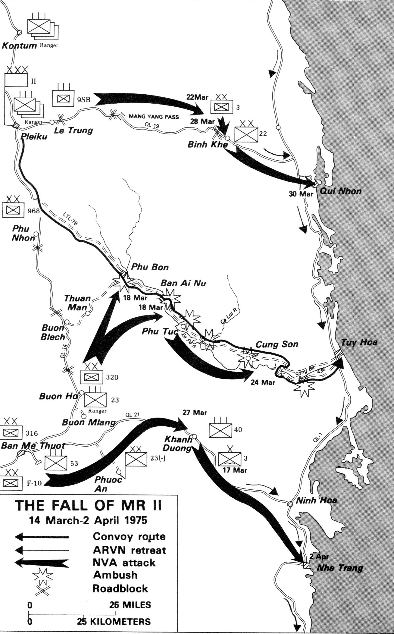 3월 31일 PAVN이 퓨 캇 공군 기지를 공격하면서 RVNAF는 약 32대의 항공기를 탈출시켰고, 약 58대의 항공기가 지상에 남겨져 대부분 비활성화되거나 파괴되었다.[14] 4월 1~2일, 사단의 약 7,000명의 병력과 빈딘 RF/PF는 베트남 공화국 해군 선박을 타고 퀴논에서 붕타우로 항해했다.[14] 제42연대와 제47연대 지휘관은 철수를 거부하고 자살했다.[15]