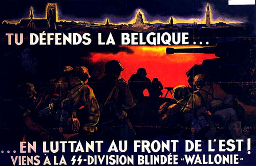 1943년경 벨기에 민족주의와 반공주의적 정서에 호소하는 발로니엔 군단의 모집 포스터. "동부 전선에서 싸우면서 벨기에를 방어하라"는 문구가 적혀 있다.