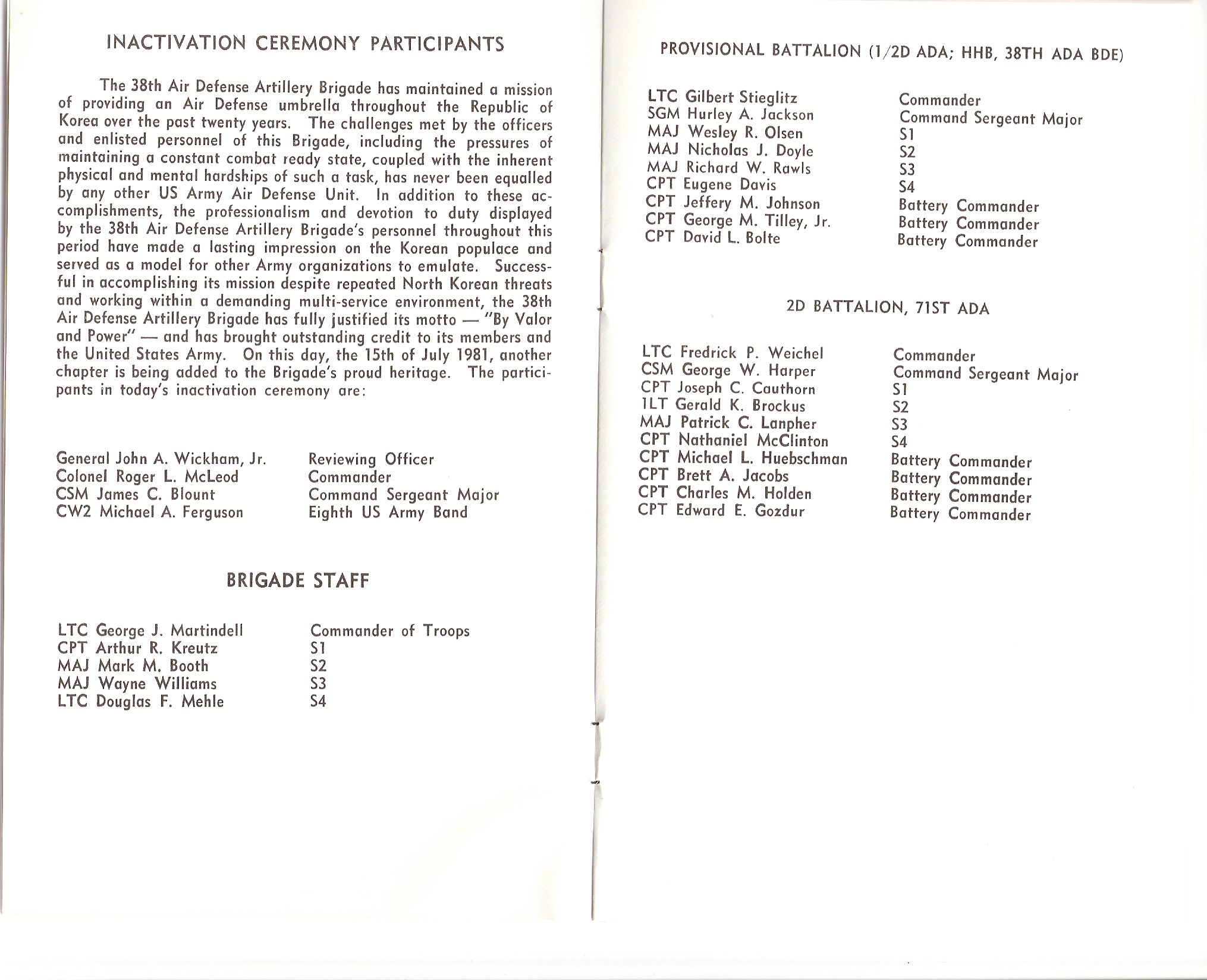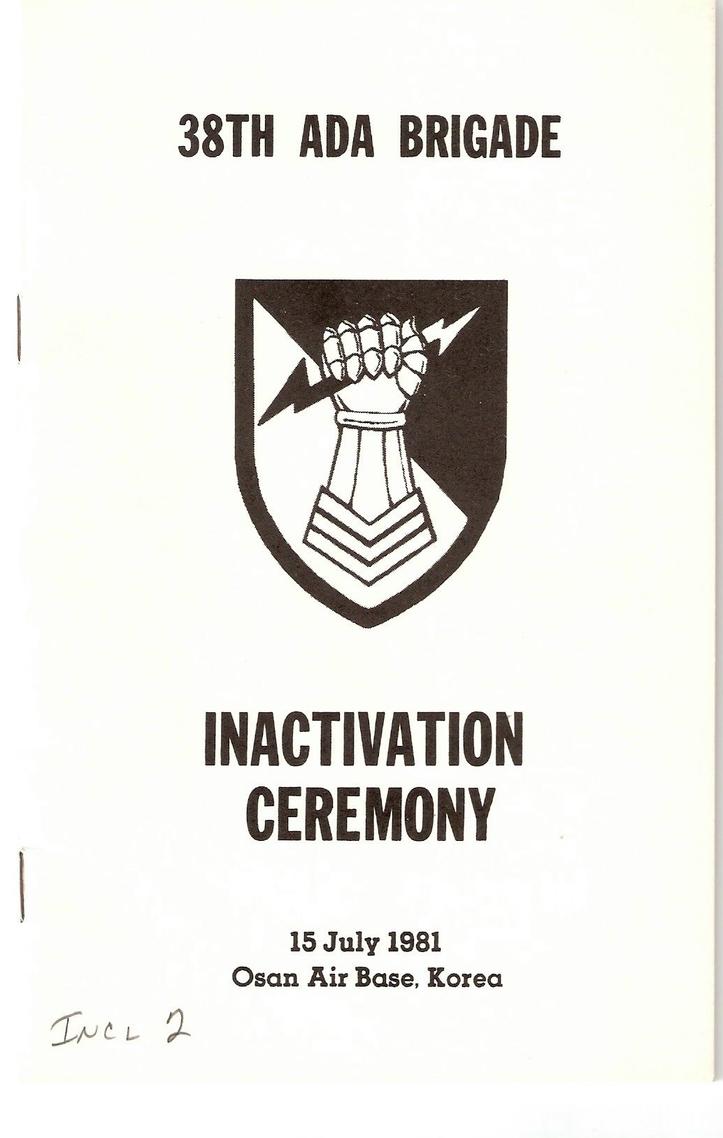 1981년 7월 15일, 대한민국 오산 공군기지에서 제38방공포병여단 해체 기념행사가 진행되었다.[1] 행사 자료는 흑백 사진으로 남아있으며, 행사 책자에는 여단 역사, 부대 마크, 역대 여단장 소개, 고별사 등이 수록되어 있다.[1]