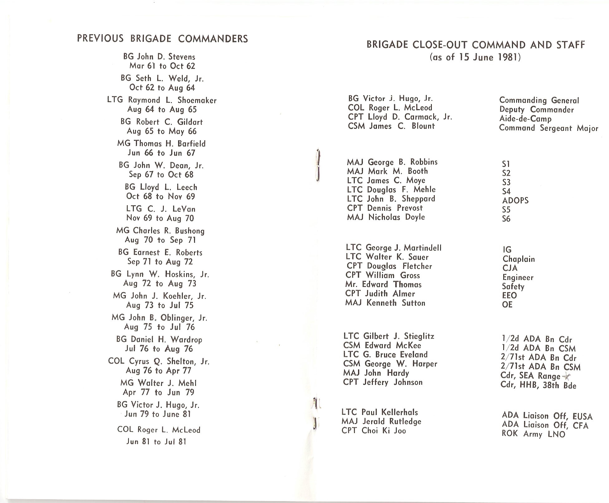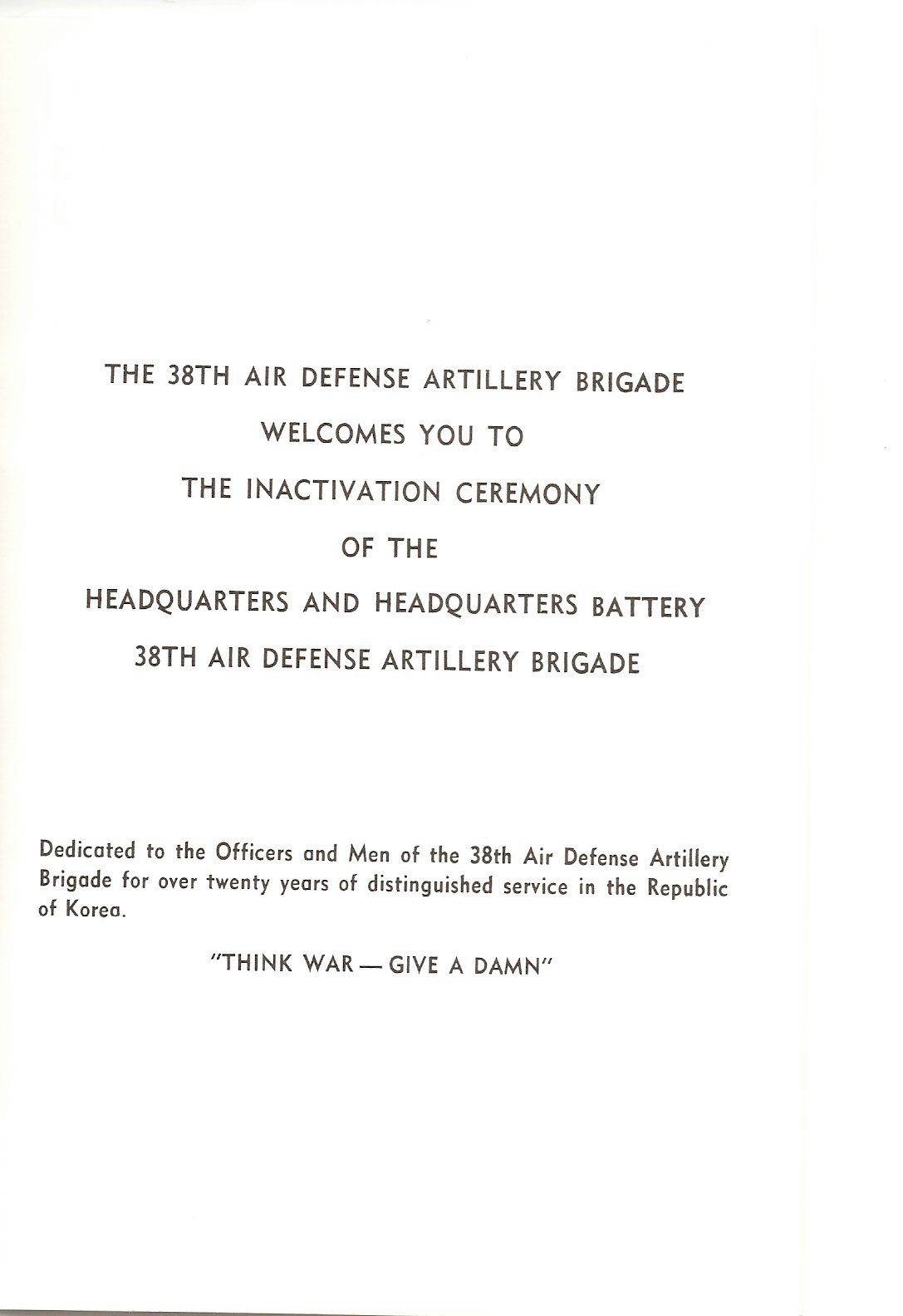 1960년 3월 20일, 제38포병여단(방공) 본부 및 본부 포대로 재지정되어 주한 미국 공군 사령관의 작전 통제를 받으며, 한국 내 미국 및 대한민국 방공 부대에 대한 작전 지휘 및 통제를 수행했다.[13] 1972년 3월 15일, 미국 육군 전투 병과 연대 체계에 따라 제38방공포병여단으로 재지정되었다. 여단 본부는 제314항공사단 및 대한민국 공군 본부와 함께 오산 공군 기지에 위치했다.[14]여단 예하 부대는 다음과 같았다.