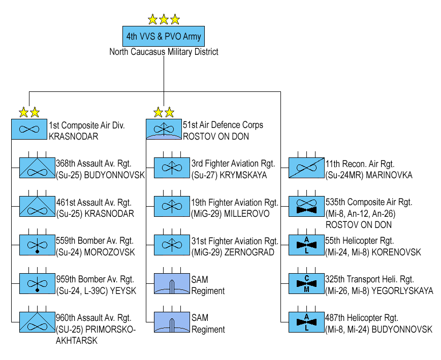 - 제1근위혼성항공사단 (크라스노다르[13]): 모로조프스크의 제559폭격항공연대(Su-24 운용), 예이스크 공항의 제959폭격항공연대(Su-24, L-39C 운용), 부됤노프스크의 제368공격항공연대(Su-25[14]), 크라스노다르의 제461공격항공연대(Su-25), 프리모르스코-아흐타르스크의 제960공격항공연대(Su-25)를 포함한다.
