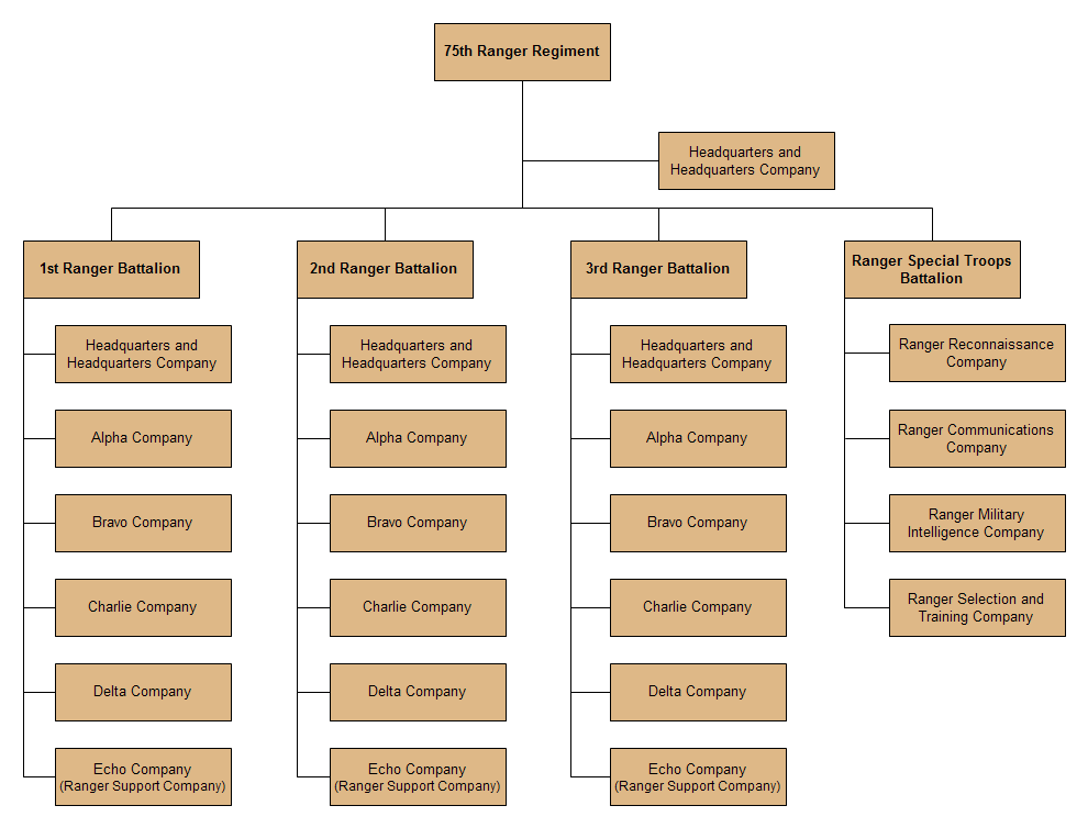 제75레인저연대는 연대 본부 및 본부 중대, 특수병력대대, 그리고 3개의 레인저 대대로 구성된다.[84]