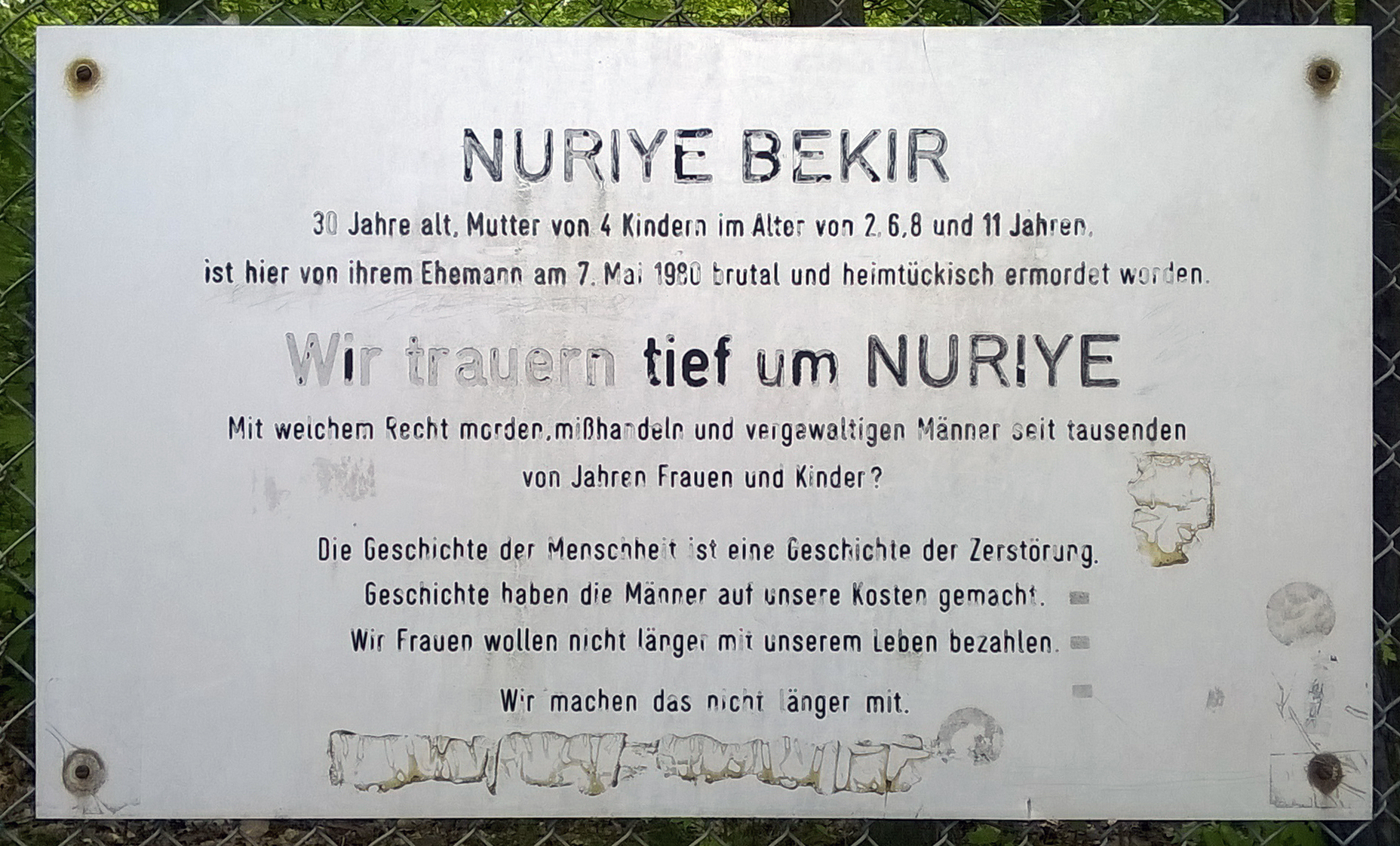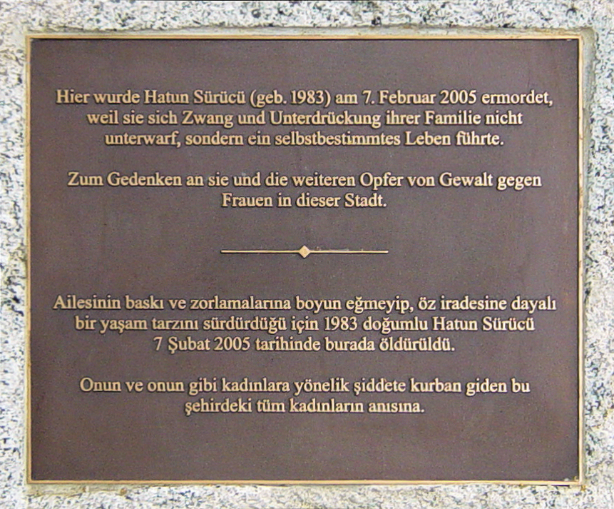 명예 살인은 가족의 명예를 더럽혔다는 이유로 여성을 살해하는 행위로, 베를린에는 명예 살인 피해자인 누리예 베키르와 하툰 쉬뤼cü를 기리는 기념 동판이 있다.