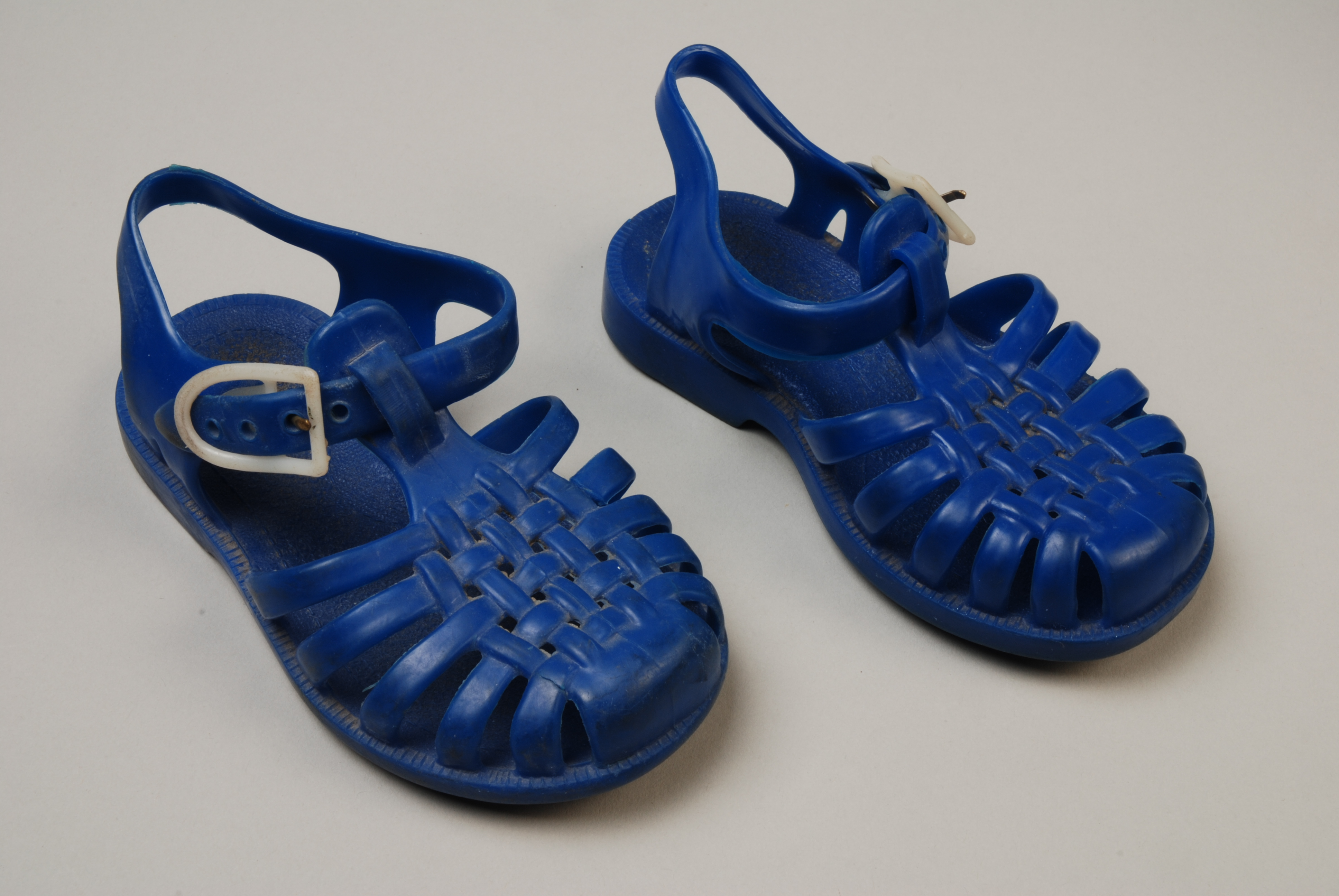 제2차 세계 대전 이후, 플라스틱과 같은 인공 재료는 가죽이나 면과 같은 천연 섬유를 대체하는 저렴한 소재로 주목받았다. 프랑스 회사 Sarraizienne|사레지엔fra은 1950년대에 최초의 PVC 신발을 만들었다고 주장하는데, 이 신발은 가격이 저렴하고 세척이 쉬워 주로 어부들이 사용했다.[7][8] 당시 투명한 플라스틱 신발은 큰 바구니에 담겨 판매되었으며, 패션 측면에서는 크게 주목받지 못했다.[1][4]2. 2. 1980년대: 젤리 슈즈의 탄생과 유행