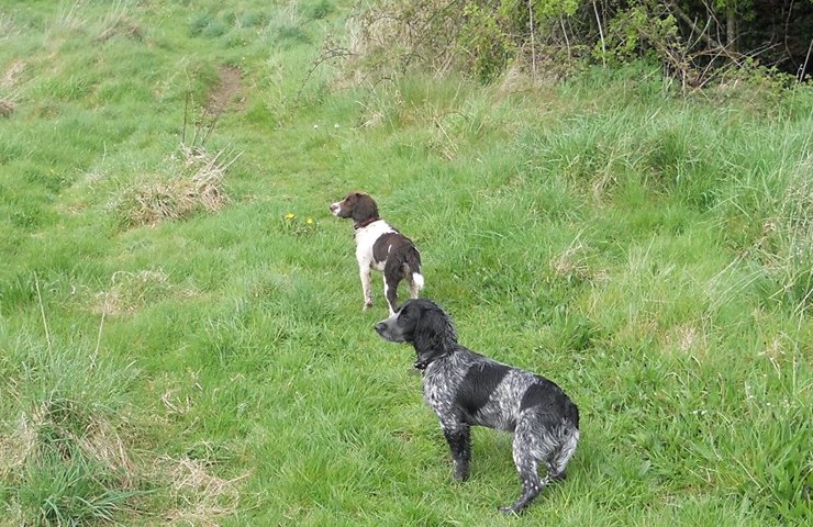 섬프러 스패니얼(간색과 흰색)과 잉글리시 코커 스패니얼(블루 로언)