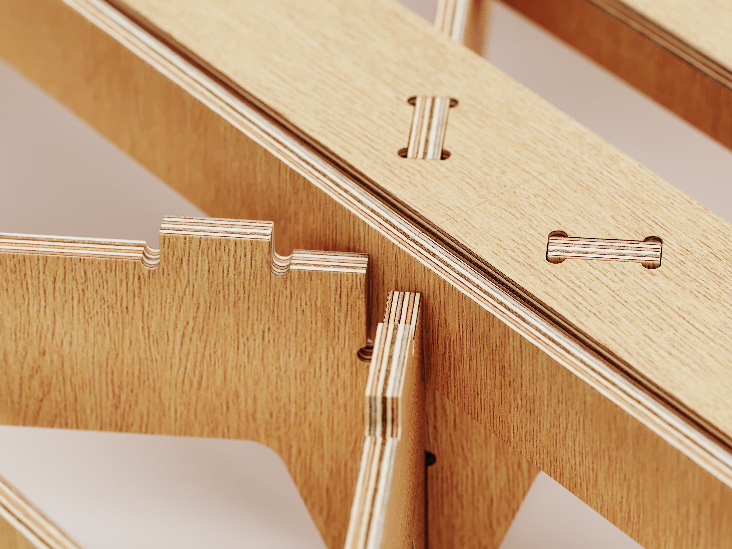 CNC(컴퓨터 수치 제어)로 절단된 합판으로 제작된 오픈 소스 침대 프레임 디자인의 세부 사항.