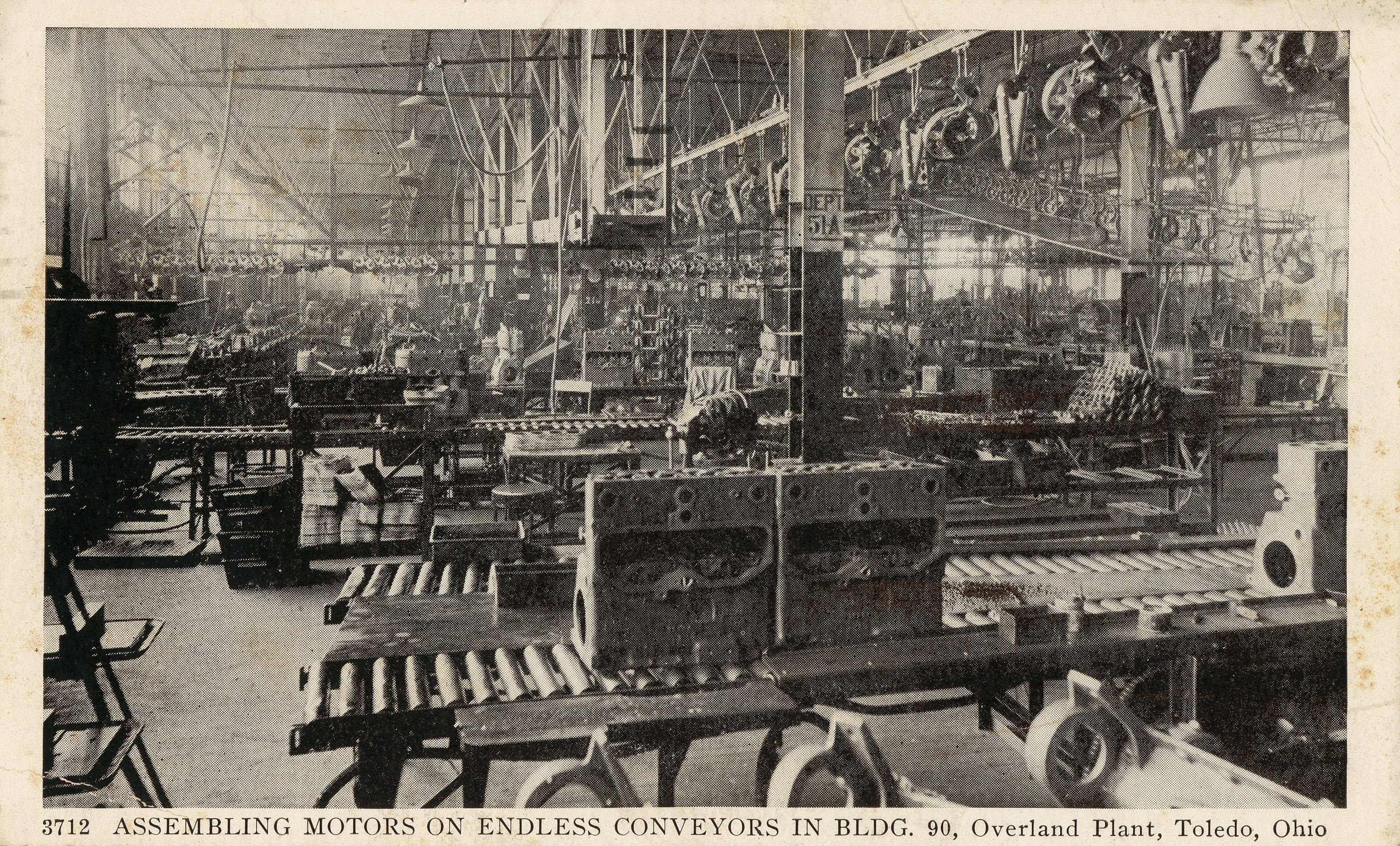 이동식 조립 라인은 포드 모델 T를 위해 개발되었으며, 1913년 10월 7일 하이랜드 파크 포드 공장에서 가동을 시작했고,[19][20] 그 후 시간 및 동작 연구를 사용하여 계속 발전했다.[18] 컨베이어 벨트로 구동되는 조립 라인은 공정을 45단계로 나눔으로써 모델 T의 생산 시간을 단 93분으로 단축했다.[15] [21]