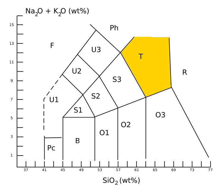 - 네펠린, 소다라이트, 백류석 같은 장석류 광물이 포함된 경우 포이드 함유 조면암으로 분류한다.[16]