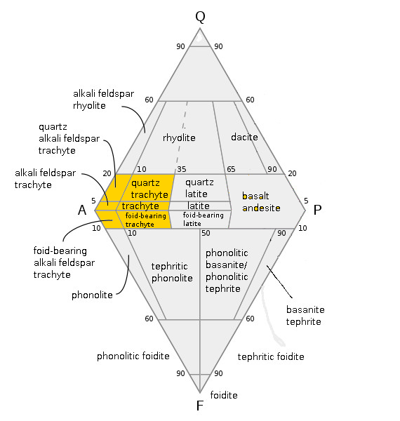 조면암보다 사장석 함량이 높아지면 Trachyandesite|조면안산암영어으로 분류된다.