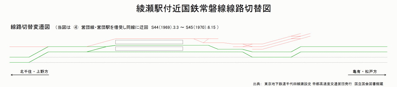 공사는 도쿄 쪽부터 순차적으로 진행되어, 1971년 3월 1일에 아야세 - 가나마치 간이 잠정 개통되어 국전과 우등 열차・화물 열차의 분리가 이루어졌다. 같은 해 3월 10일에는 가나마치 - 기타카시와 간이, 4월 1일에는 기타카시와 - 아비코 간이 잠정 개통되어 복복선 공사가 완료되었다. 1971년 4월 20일에는 아야세 역 - 아비코 역 간 복복선화가 완성되었다.