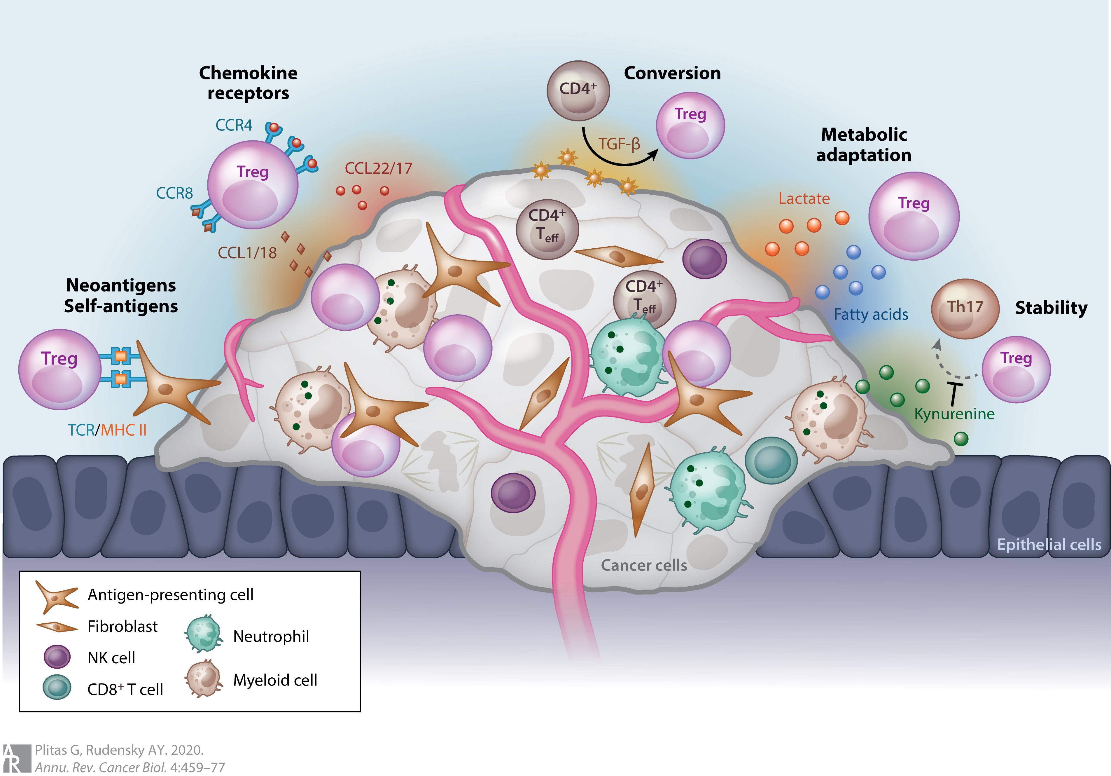 종양 미세환경은 케모카인 등을 통해 조절 T 세포를 유인하며, TGF-β 등은 조절 T 세포의 분화 및 확장을 유도한다.[162] 많은 유형의 종양 세포에서 분비되는 리간드인 CCL22와 조절 T 세포에 발현되는 케모카인 수용체인 CCR4의 결합은 조절 T 세포의 종양 미세환경 침윤을 촉진한다.[162]