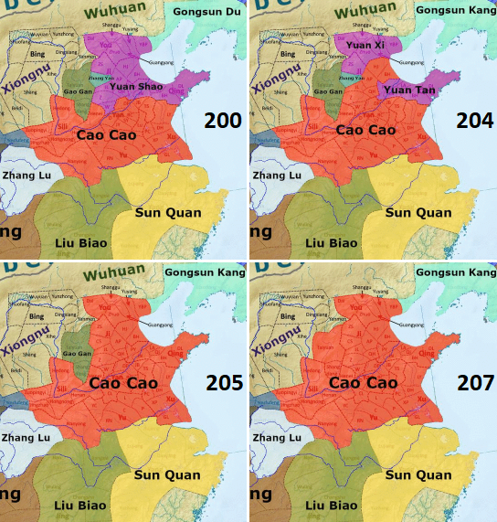 202년 초여름 원소가 병사하고 그의 셋째 아들 원상이 뒤를 이었다. 203년 봄, 조조는 다시 원씨 형제를 공격하여 패배시켰다.[63]