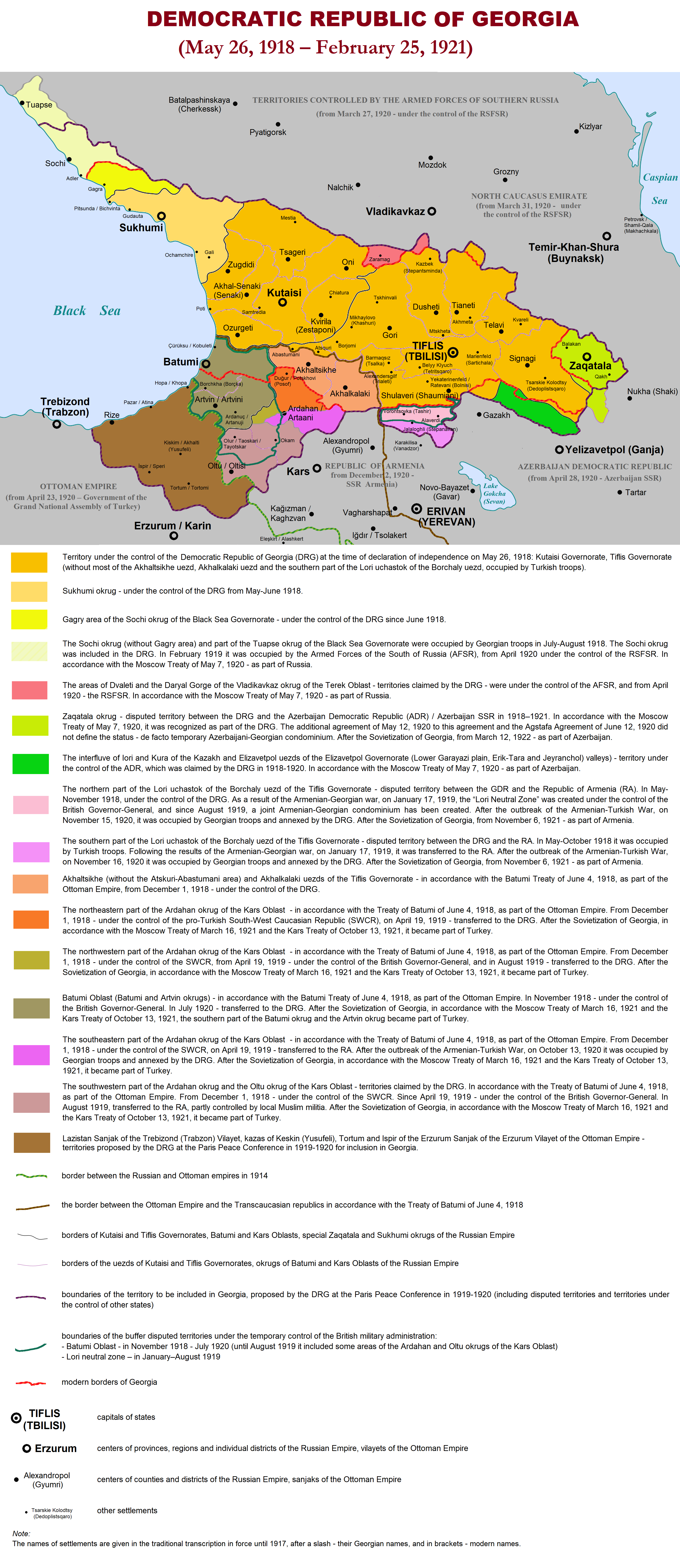 1919년 파리 강화 회의에서 조지아 대표단이 제안한 조지아 민주 공화국에 포함될 영토(빗금 친 부분은 1921년 이후 인접 국가에 귀속됨)
