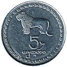 ![]() | ![]() | 5 테트리 | 20mm | 2.5g | 스테인리스 스틸 | 매끄러움 | 기원전 3천년기 알라자니 계곡의 무덤에서 나온 사자의 금빛 조각상, 금액 표기 “5”와 아래쪽의 თეთრიka () 명칭. | |