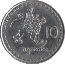 ![]() | ![]() | 10 테트리 | 21.9mm | 3g | 스테인리스 스틸 | 매끄러움 | 사자를 타고 있는 성 마메, 11세기 겔라티 수도원의 금박을 입힌 은색 접시. 동전의 오른쪽에 금액 표기 “10”, 아래쪽에 თეთრიka () 명칭. | |
