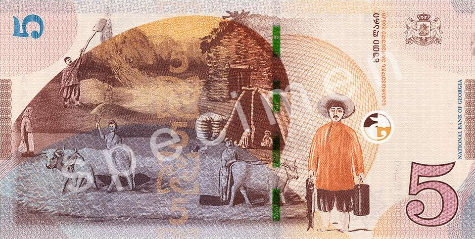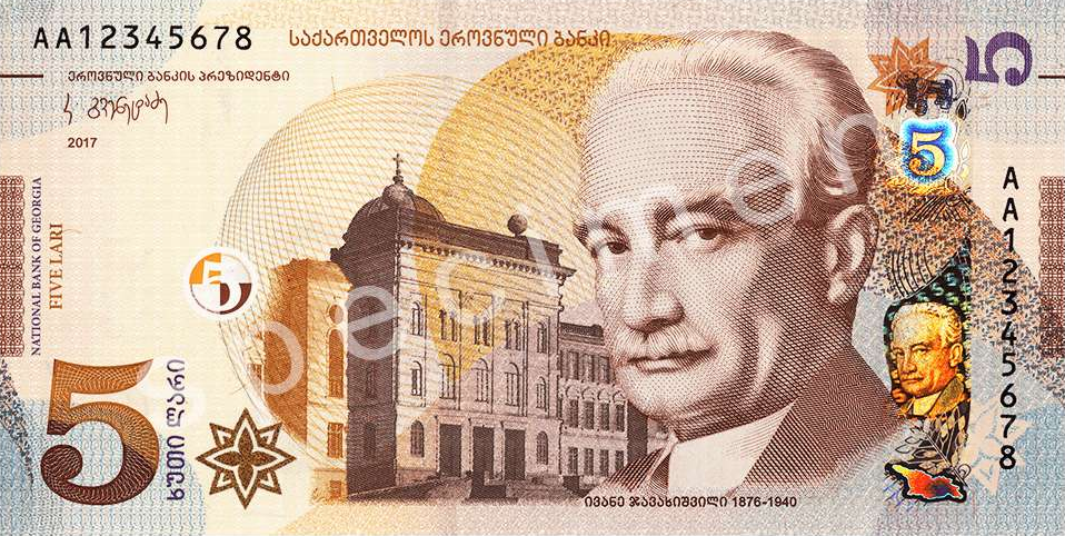 ![]() | ![]() | 5라리 | 122 x 62 mm | 갈색 | 이바네 자바히시빌리의 초상과 "ივანე ჯავახიშვილი 1876–1940"이라는 글귀, 이바네 자바히시빌리 트빌리시 주립대학교 본관 | 니코 피로스마니의 그림 「탈곡」과 「빨간 셔츠를 입은 어부」의 세부 묘사, 그리고 조지아 문장 | 2017 | 2017년 9월 1일 |