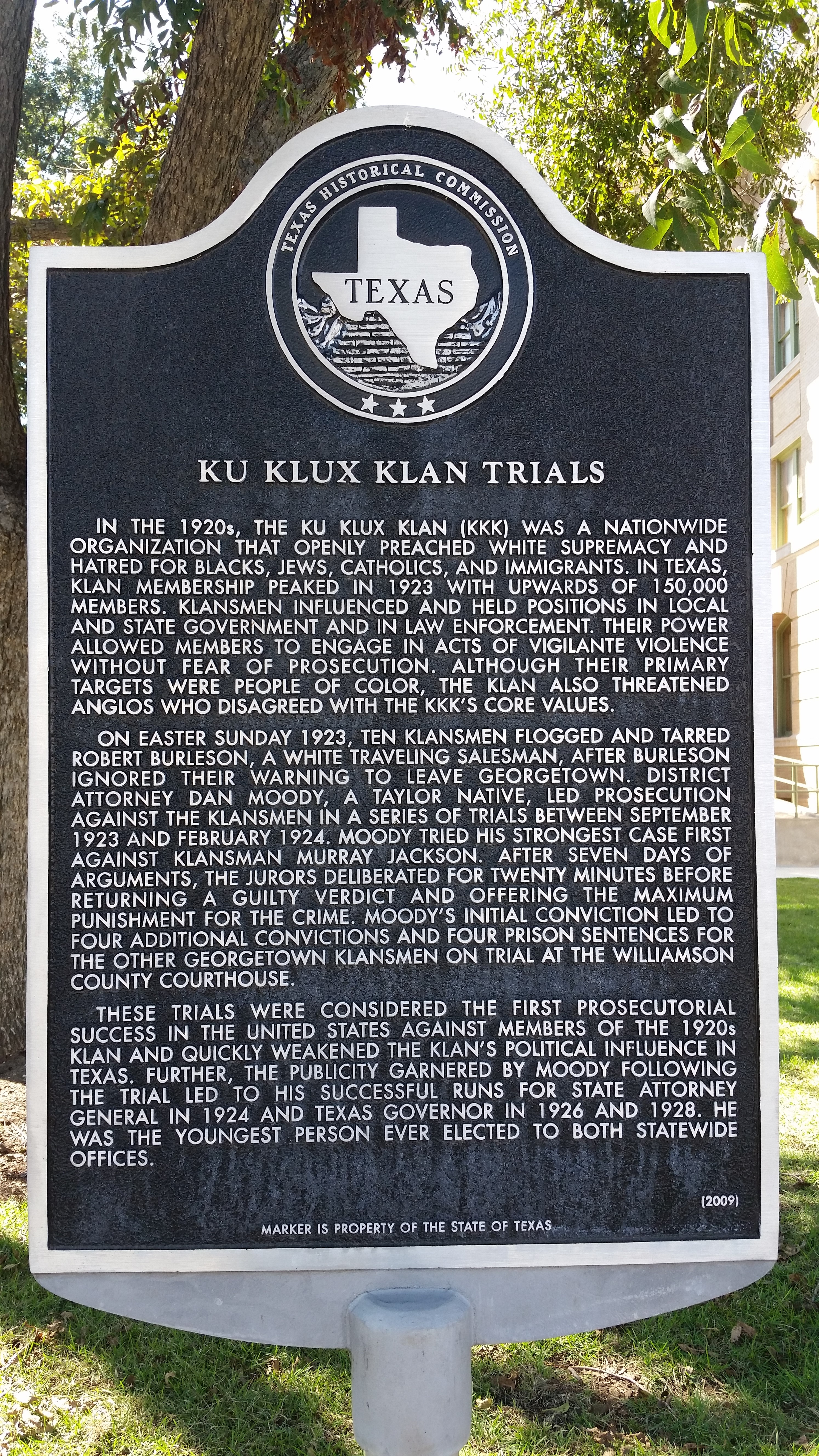 1923년 9월부터 1924년 2월까지, 지방 검사 댄 무디는 윌리엄슨 카운티 법원에서 쿠 클럭스 클랜을 상대로 일련의 재판을 진행했다. 이 재판에서 쿠 클럭스 클랜 회원 5명은 백인 여행 판매원을 구타하고 타르를 바른 혐의로 유죄 판결을 받았다.[17] 텍사스 역사 위원회는 "이 재판은 1920년대 클랜을 상대로 미국에서 처음으로 성공한 기소였으며, 텍사스에서 클랜의 정치적 영향력을 빠르게 약화시켰다"고 기록했다.[17]