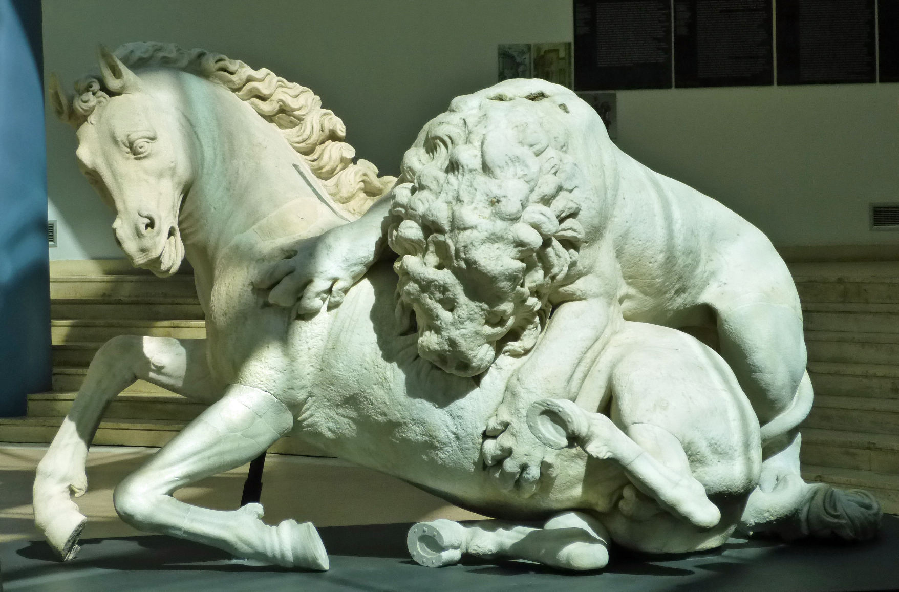 이 주제의 기원에 관한 일화는 화가가 사망한 직후, 1808년 The Sporting Magazine에 게재되었고, 150년 이상 반복적으로 언급되었다. 미술사학자 H. W. 얀슨은 "북아프리카를 방문했을 때, 그는 사자에게 죽임을 당한 말을 보았다. 이 경험은 그의 상상력을 사로잡았고, 그로부터 그는 자연의 웅장함과 폭력에 대한 낭만적인 감정으로 가득 찬 새로운 유형의 동물 그림을 발전시켰다."라고 언급했다.[13] 그러나 1965년에 발표된 연구는 스터브스가 아프리카를 여행한 적이 없으며, 그림의 실제 영감은 1754년 로마 체류 동안 잘 기록된 고대 조각상에서 얻었다고 주장한다. 로마 콘세르바토리 궁전에 있는 조각상 '말을 움켜쥐는 사자'는 헬레니즘 원본의 복원된 로마 복사본이다. 이 작품은 르네상스 시대부터 유명했으며, 미켈란젤로의 칭찬을 받았고, 스터브스 시대의 가이드북에 포함되었으며, 스터브스의 후원자였던 헨리 블런델의 소장품에 있는 18세기 대리석 복사본을 포함하여 다양한 예술가들이 복사했다. 블런델은 스터브스의 그림 중 하나도 구입했다.[11][12]