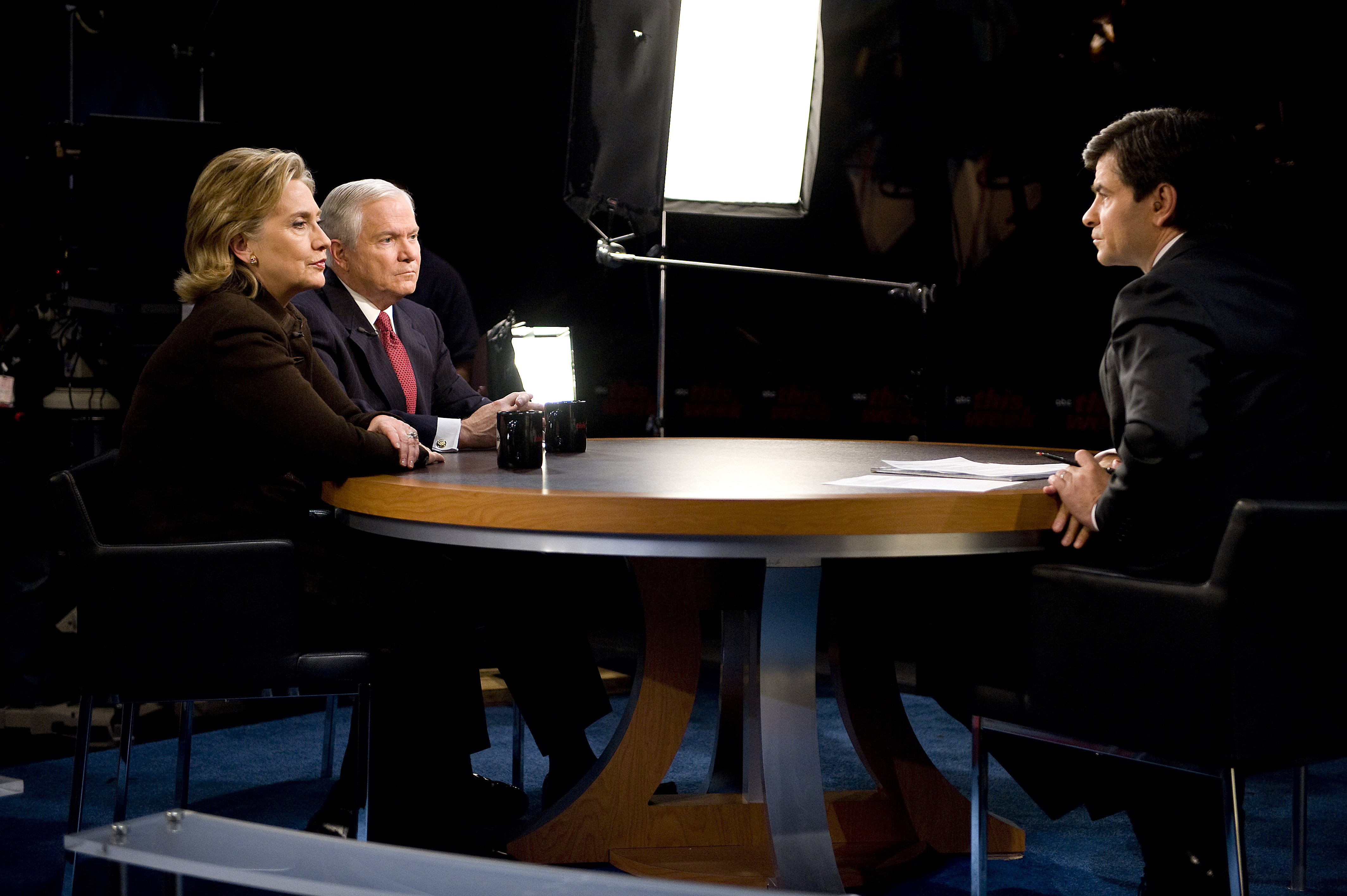 2009년 12월 워싱턴 D.C.에서 로버트 M. 게이츠 국방 장관과 힐러리 클린턴 국무 장관이 조지 스테파노펄러스와 대화하고 있다.