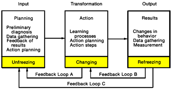 제2차 세계 대전 초기, 레빈은 계획, 실행, 결과 측정의 3단계 협업적 변화 프로세스를 실험했는데, 이는 액션 리서치의 선구적 형태였다. 레빈은 T-그룹(실험실 훈련)이라는 학습 방법도 시작했다. 1947년 레빈 사후, 그의 동료들은 미시간 대학교에서 설문 조사 연구 방법을 개발했다.[5]