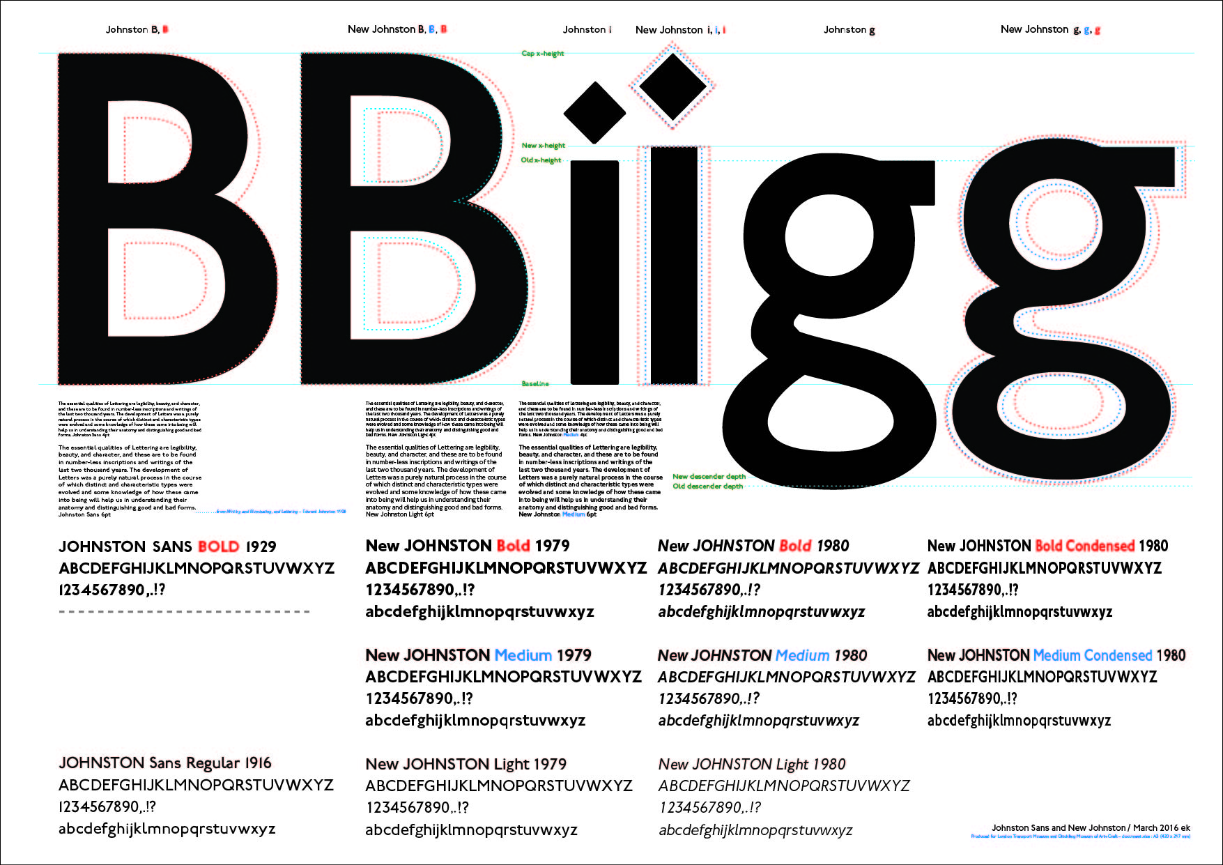 존스턴의 원래 디자인은 일반체와 볼드체 두 가지 굵기로 제공되었으며, 버스 노선과 목적지를 표시하기 위해 곧 축약된 글자가 추가되었다. Heavy체에는 소문자가 없다.[18] 존스턴은 언더그라운드 시스템을 위한 다른 글자체와 브랜딩 작업도 했는데, 가장 유명한 것은 언더그라운드가 계속 사용하고 있는 '바와 원' 라운델(라운델이 붉은색이었던 초기 디자인에서 개선됨)이다.[19]