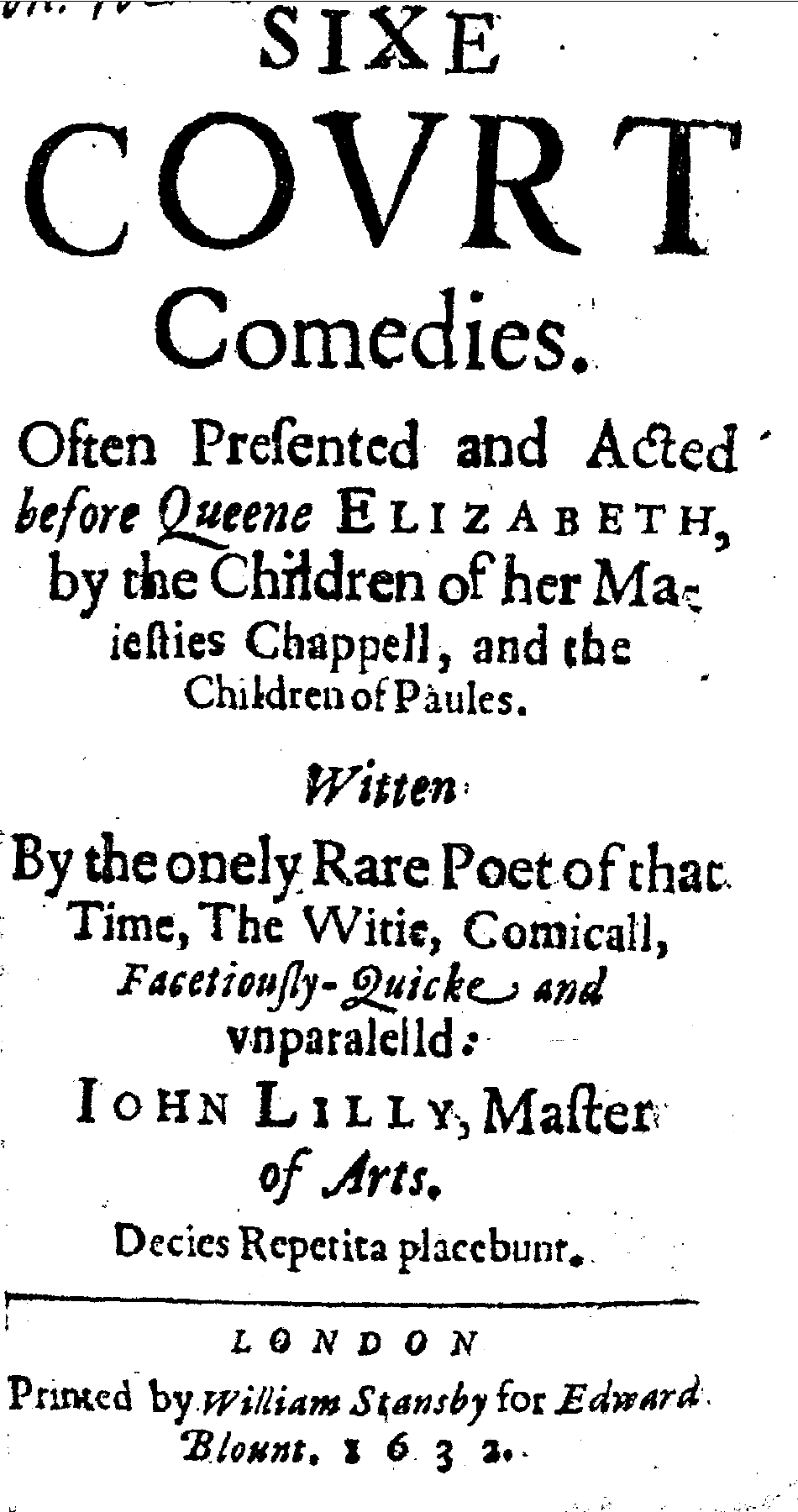 릴리의 희곡 첫 번째 컬렉션인 ''6개의 궁정 희극''(Six Court Comedies)은 1632년 에드워드 블런트(Edward Blount)에 의해 12절판으로 출판되었는데, 이는 셰익스피어의 희곡 두 번째 폴리오(Second Folio)가 출판된 해와 같다. 이 컬렉션에는 ''엔디미온'', ''캠파스페'', ''사포와 파오'', ''갈라테아'', ''미다스'', ''마더 봄비''가 순서대로 수록되어 있다. 마지막 두 작품인 ''달 속의 여인''과 ''사랑의 변신''은 이 컬렉션에서 제외되었다. 이 컬렉션을 통해 ''캠파스페''와 ''갈라테아''의 노래가 처음으로 인쇄되었다.