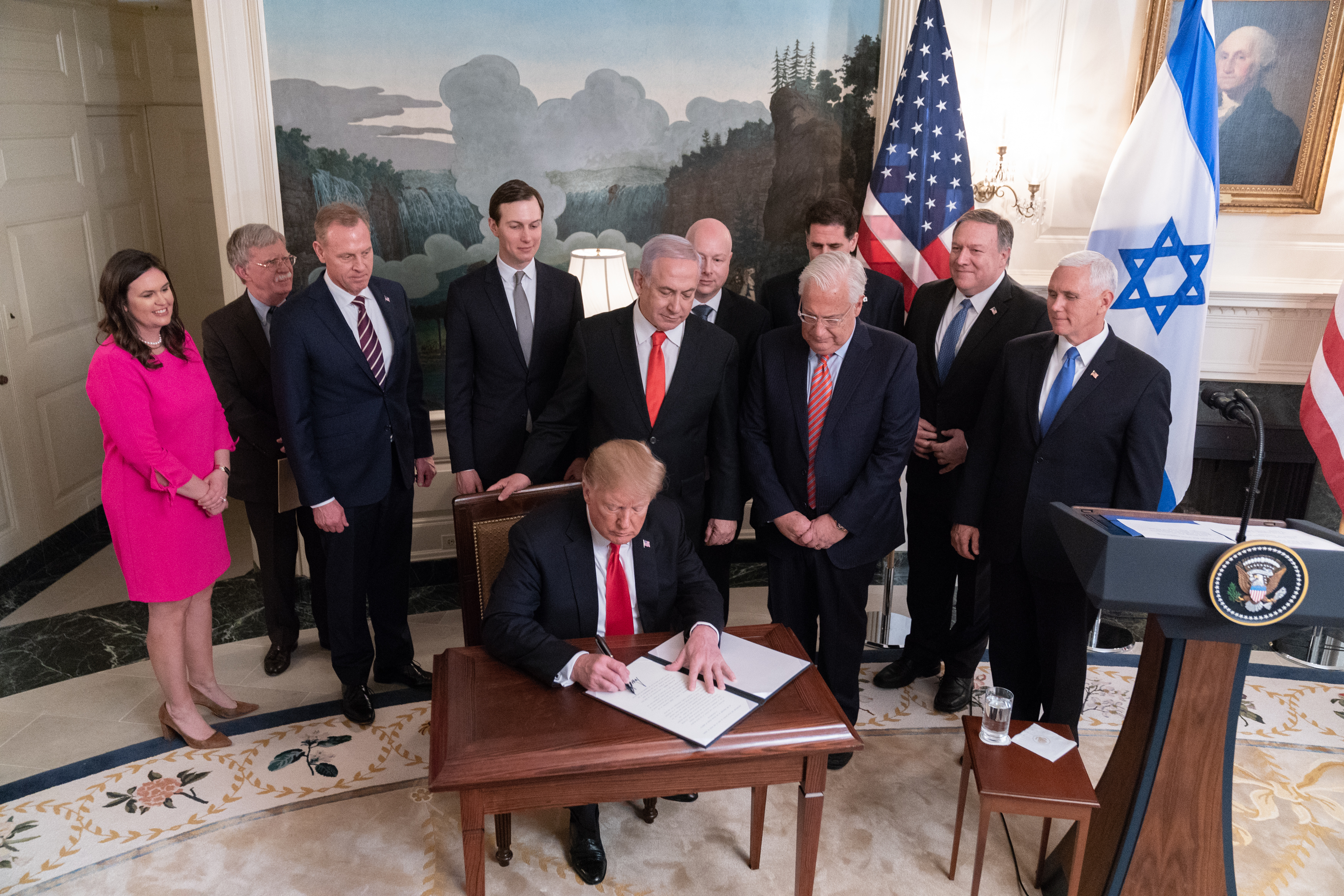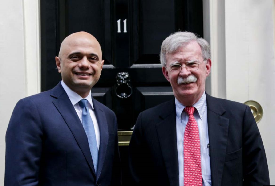 2019년 6월 20일 이란 이슬람 혁명 수비대가 미군 무인정찰기(드론)를 격추하자 트럼프 대통령의 대이란 군사 행동 결정을 지지했지만, 공격 10분 전에 철회되었다.[343] 이란의 모하마드 자바드 자리프 외무장관은 이란에 적대적인 이스라엘의 베냐민 네타냐후 총리와 사우디아라비아의 무함마드 빈 살만 왕세자와 함께 "B팀"(Team B와는 무관)이라고 자주 불렸다.[344]