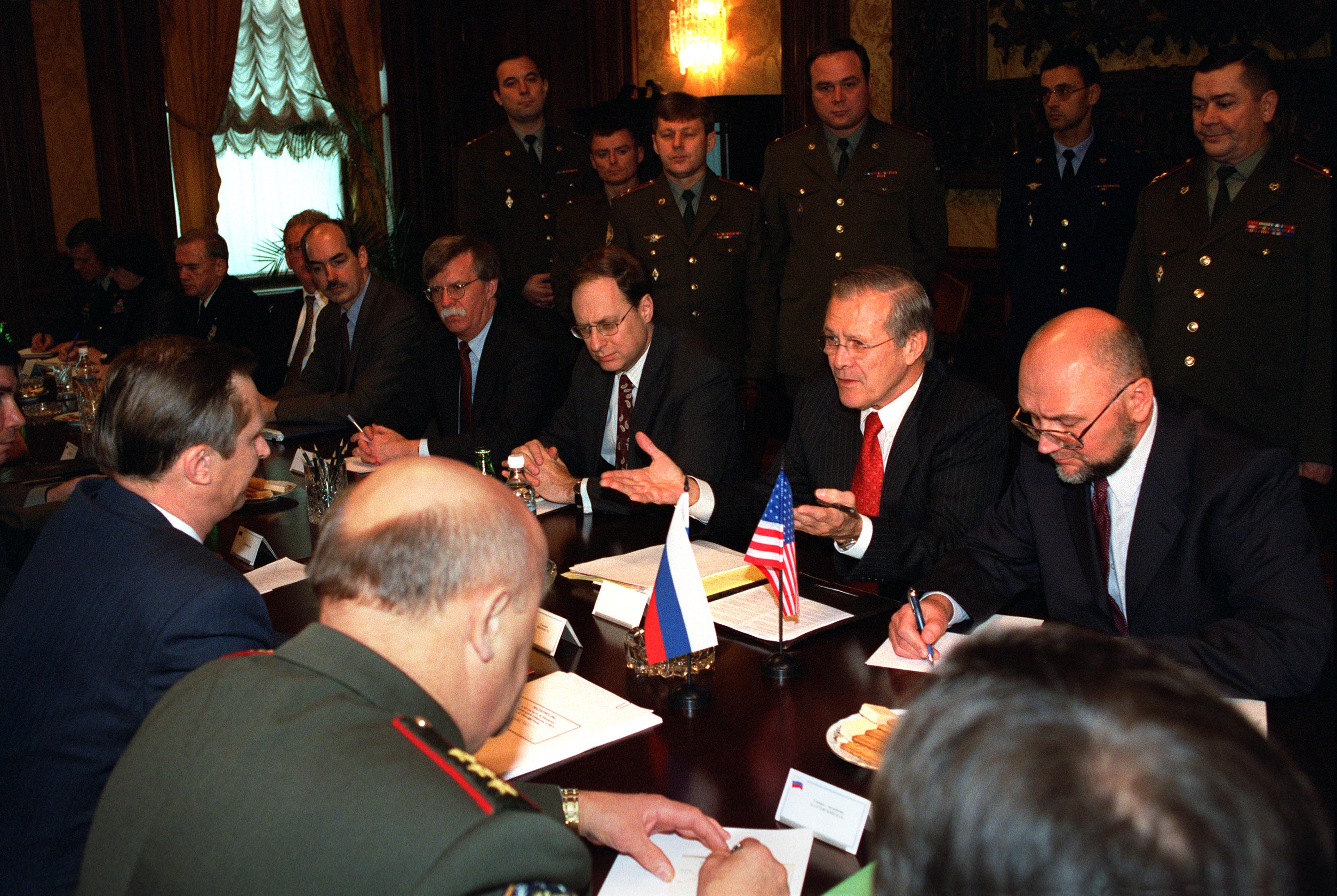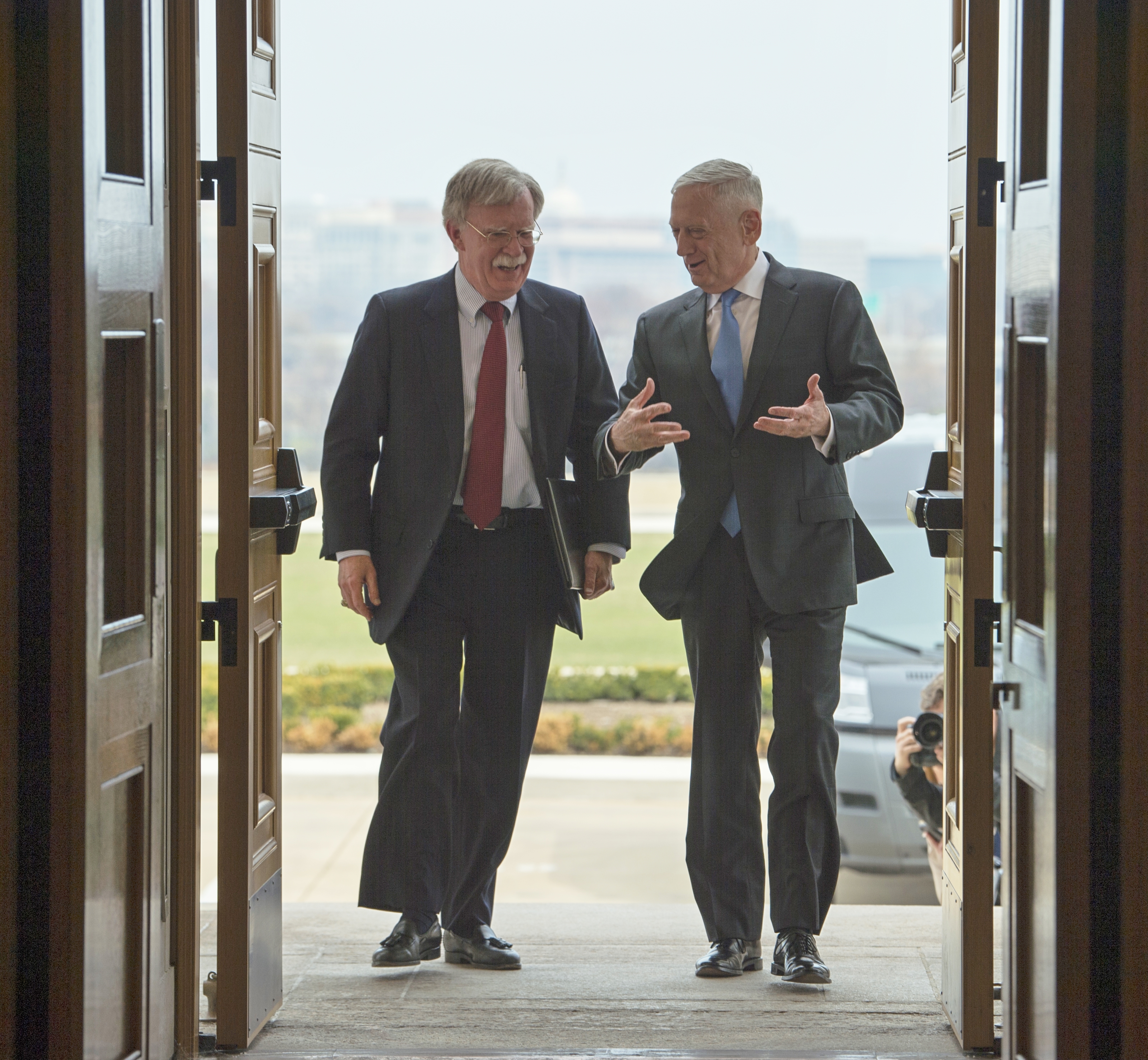 '''뉴욕 타임스'''는 2018년 3월 22일 존 볼턴이 H. R. 맥마스터를 대신해 국가안보보좌관이 될 것이라고 보도했고, 트럼프는 같은 날 트윗을 통해 이를 확인했다. 볼턴은 2018년 4월 9일 국가안보보좌관직을 시작했다.[152][153] '''뉴욕 타임스'''는 볼턴과 마이크 폼페이오의 부상과 렉스 틸러슨과 맥마스터 장군의 퇴진은 트럼프의 외교 정책 팀을 "현대 기억에 남을 만큼 미국 대통령 주변에서 가장 급진적으로 공격적인 외교 정책 팀"으로 만들었고, 특히 딕 체니와 도널드 럼즈펠드가 있던 조지 W. 부시 주변의 외교 정책 팀과 비교했다.[154]