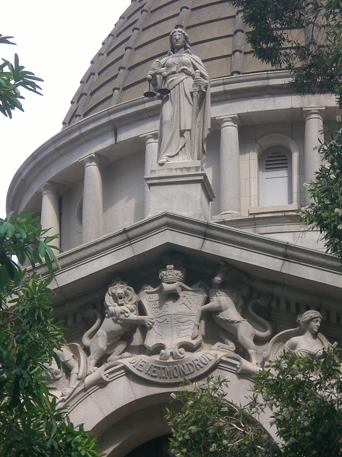 황후상광장을 바라보는 건물 중앙에는 페디먼트가 있다. 페디먼트 위에는 정의의 여신상이 있고, 그 아래에는 'Erected AD MDCCCX' (서기 1910년 준공)라는 문구가 새겨져 있다.[8] 페디먼트에는 반원형 창문이 있으며, 그 위에는 영국 왕실 문장이 조각되어 있다. 왕실 문장 속 방패는 넷으로 나뉘어 있는데, 첫째와 넷째 부분에는 잉글랜드의 사자 세 마리가, 둘째 부분에는 스코틀랜드의 사자가, 셋째 부분에는 아일랜드의 하프가 그려져 있다. 이 방패는 잉글랜드 사자와 스코틀랜드 유니콘이 받치고 있으며, 방패 위에는 왕관이 올려져 있다. 방패 아래에는 왕실 표어인 '신과 나의 권리' (Dieu et mon droit)가 새겨져 있다. 왕실 문장 양옆에는 자비와 진실의 여신상이 배치되어 있다.[8]