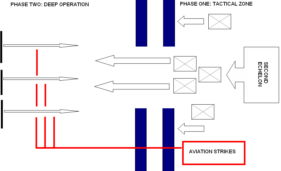 게오르기 사모일로비치 이세르손은 붉은 군대의 공격 제대(에셜론)가 100~120 km 종심을 가져야 한다고 계산했다. 그는 적의 전술적 방어가 2개의 전선으로 구성될 것이라고 추정했다. 첫 번째 전선은 얕고 5~6 km까지 뻗어 있으며, 두 번째 전선은 그 뒤에 형성되어 12~15 km의 종심을 가질 것이라고 예상했다. 그 너머에는 철도 종착역과 보급 기지를 포함하는 50~60 km 종심의 작전 종심이 있으며, 이곳에 주요 적 부대가 집중될 것이라고 보았다. 작전 종심 너머의 세 번째 구역은 전략 종심으로, 국가의 인력 자원과 산업 전력 공급 시설, 군사 작전 지역 간의 중요한 연결 고리 역할을 하며, 야전군 수준을 포함하는 전략적 병력의 사령부가 위치한다고 하였다.[20]