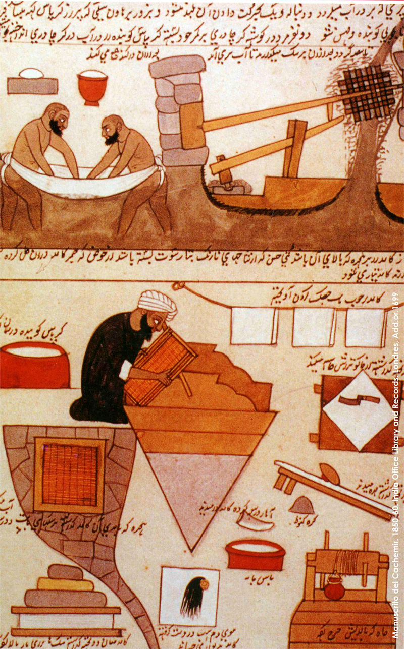 페르시아어 삽화에는 전통적인 제지 공정의 단계와 도구들이 묘사되어 있다. 제지 공정은 크게 두 단계로 나뉘는데, 첫 번째는 펄프 제조 및 탈수 단계이다. 수력 방앗간에서 리넨 폐기물과 헝겊 조각을 물과 섞어 돌 구덩이에서 두드린 후, 물기 있는 펄프를 천에 부어 초기 탈수, 균질화, 정화 과정을 거친다. 두 번째는 종이 최종 처리 단계로, 펄프 성형, 압착, 사이징, 건조, 광택 처리 등의 여러 단계로 구성된다. 각 단계는 특정 장치를 사용하여 수행되었으며, 건조 과정에서는 말총을 이용해 종이를 벽에 붙였다.
