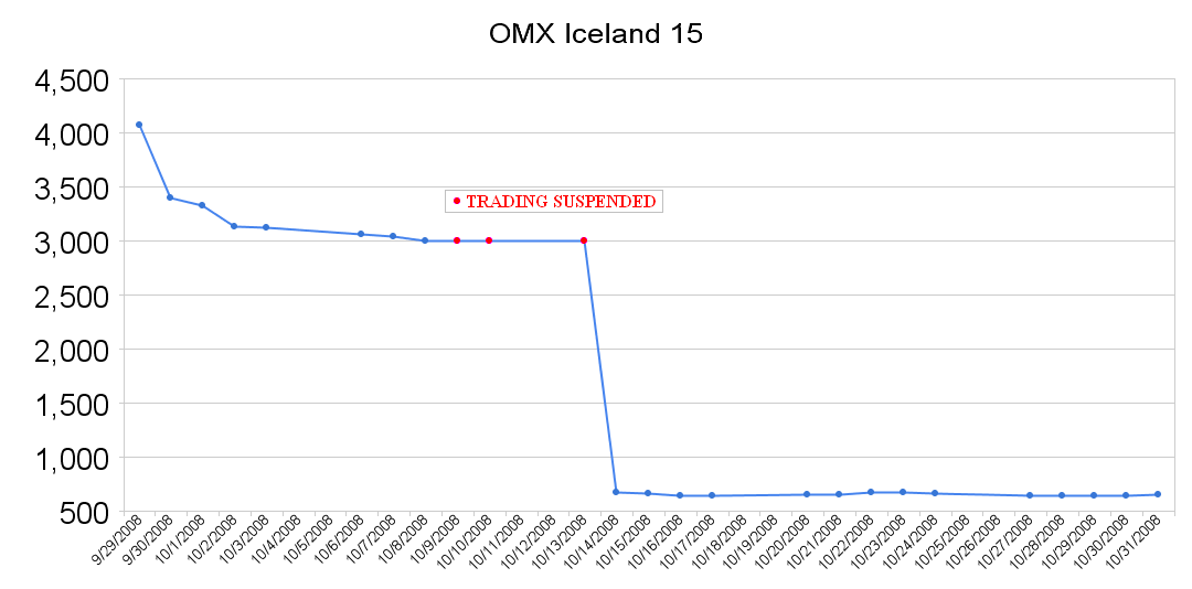 2008년 10월 6일부터 10일까지, 다우 존스 산업평균지수(DJIA)는 5거래일 연속 하락했다. 거래량은 기록을 경신했다. DJIA는 1,874포인트 이상, 즉 18% 하락하여 포인트 및 백분율 기준으로 역대 최악의 주간 하락세를 기록했다. S&P 500 지수는 20% 이상 하락했다.[19] 그 주는 또한 10월 8일 5위, 10월 9일 10위, 10월 10일 1위로 3개의 최고 10위 NYSE 그룹 거래량 기록을 세웠다. 3일 연속 거래가 중단(10월 9일, 10일, 13일)된 후, 아이슬란드 증시는 10월 14일에 재개장했으며, 주요 지수인 OMX Iceland 15는 678.4로 마감했는데, 이는 10월 8일 종가 3,004.6보다 약 77% 낮은 수준이었다. 이는 OMX Iceland 15 가치의 73.2%를 차지했던 3대 은행의 가치가 0으로 설정되었음을 반영했다.