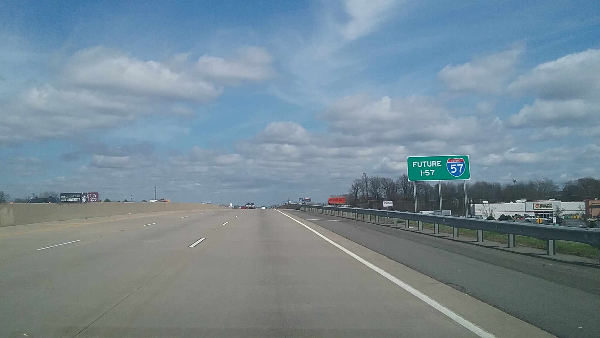 I-57은 서쪽으로 US 60을 따라 미주리주 팝라블러프까지, 그리고 US 67 회랑을 따라 남쪽으로 아칸소주 노스리틀록까지 연장되어 I-40에서 끝나는 것으로 예정되어 있다.[16] 이 연장은 고 우선 순위 회랑 89, I-57 회랑 확장에 등재되어 있다.[17] 2016년 4월, 노스 리틀록에서 아칸소주 월넛 리지까지의 US 67을 "미래 I-57"로 지정하는 조항이 2017년 연방 회계 연도 2017 교통, 주택 및 도시 개발 자금 법안에 추가되어 공식적으로 법률이 되었다.[18] 2024년 11월 7일, 아칸소 교통부(ArDOT)는 아칸소주 노스 리틀록과 월넛 리지 사이의 US 67 구간을 공식적으로 I-57로 지정했다.[19]