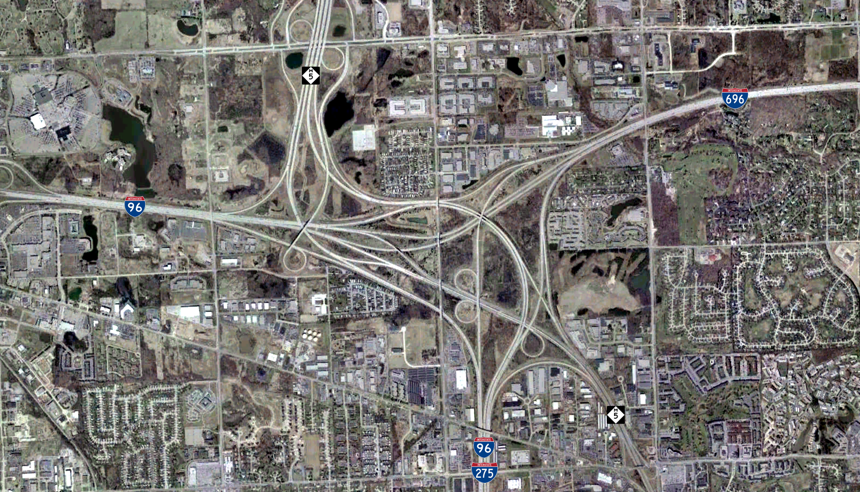 노비와 파밍턴힐스에 있는 M-5, I-275, I-696의 인터체인지 위성 이미지