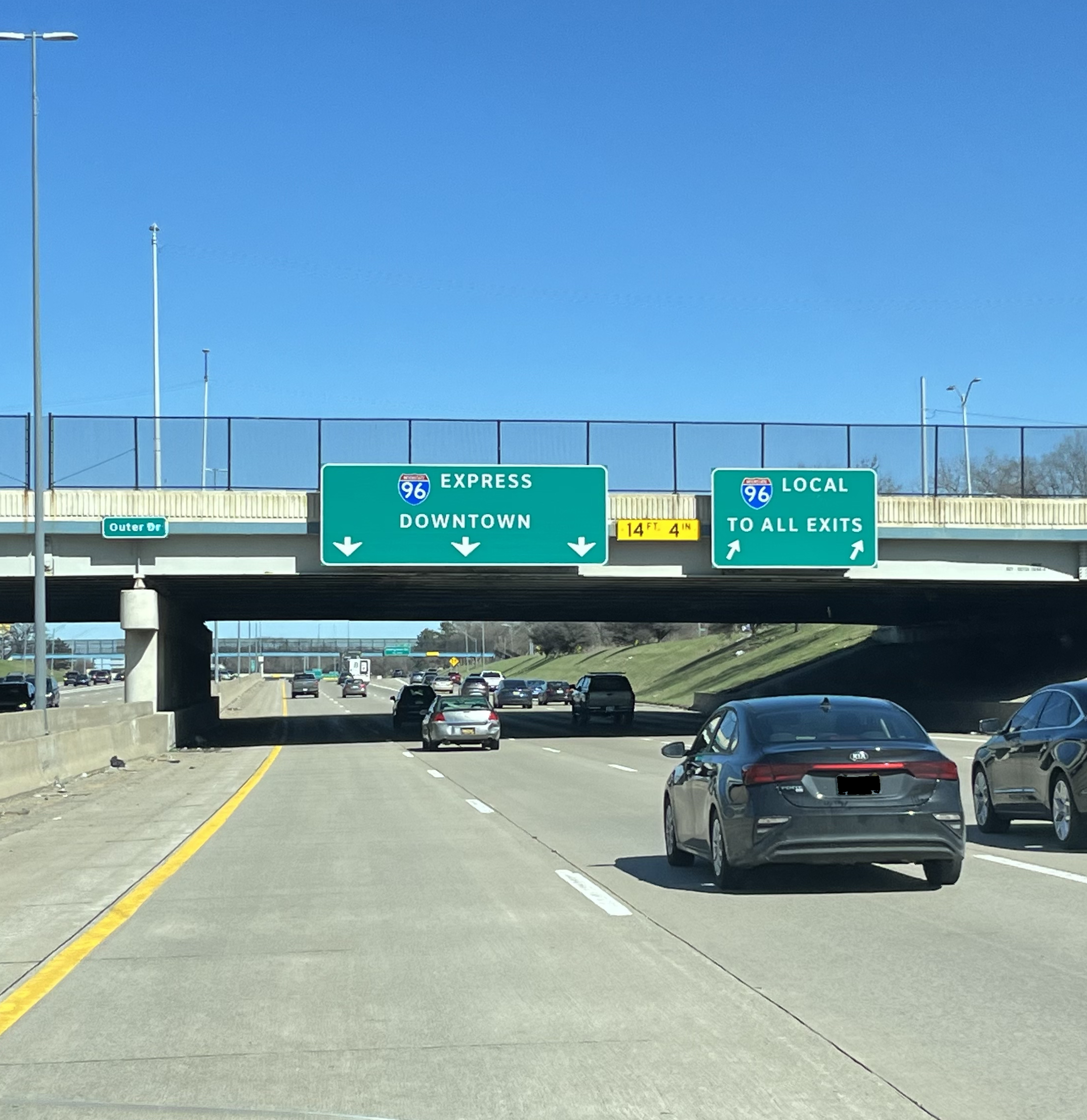 아우터 드라이브 인터체인지를 지나 I-96은 로컬-익스프레스 차선 구성으로 분리된다. M-39 (사우스필드 고속도로)와의 인터체인지에는 로컬 차선과 익스프레스 차선 사이를 통과할 수 있도록 슬립 램프가 설치되어 있다. 더 동쪽으로 가면 I-96은 북동쪽으로 방향을 틀어 M-5 (그랜드 리버 애비뉴)를 가로지른다. I-96은 M-8 (데이비슨 애비뉴)와의 인터체인지로 굽어지며 로컬-익스프레스 구성은 종료된다.[7][8]