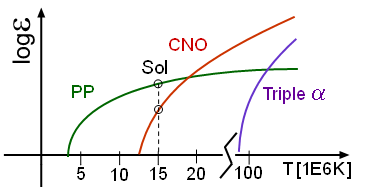 중심핵 온도가 1800만 K에 이르면 CNO 순환과 양성자-양성자 연쇄 반응 모두 효율적인 융합 방법이 된다. 이 온도는 1.5배인 항성에서 생성될 수 있다. 따라서 분광형 F형 및 그보다 차가운 별들은 하위 주계열성, 분광형 A형 및 그보다 뜨거운 별들은 상위 주계열성으로 분류된다.[107] 태양(1)의 경우 CNO 순환으로 생성되는 에너지는 전체의 1.5%에 불과하다.[119] 반면 1.8 태양질량 이상의 별들은 에너지의 거의 전체를 CNO 순환으로 생성한다.[120]